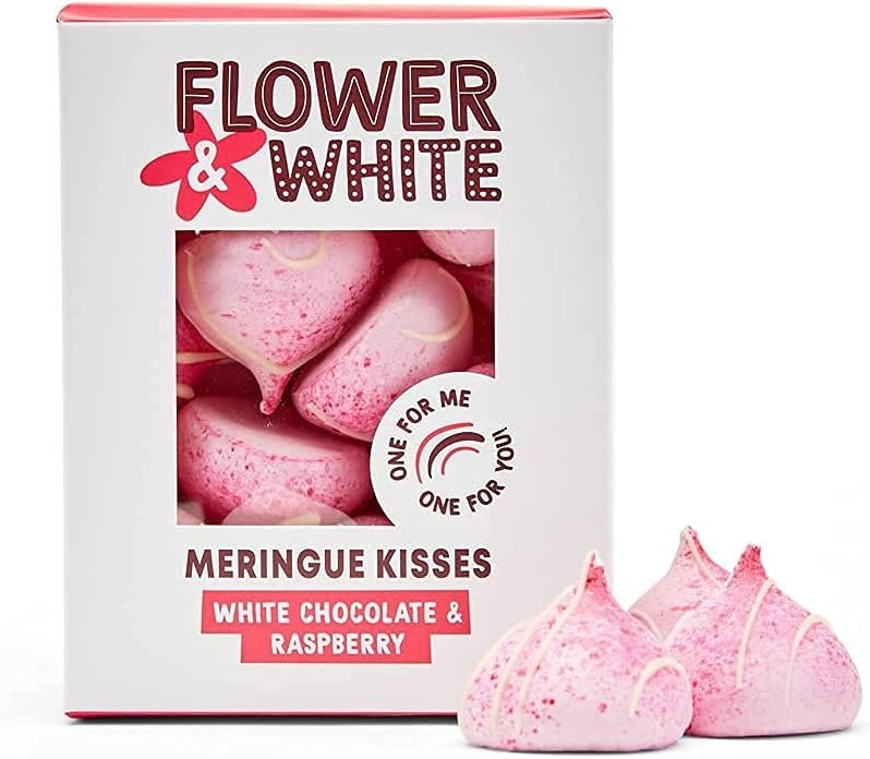 Flower & White's delicious raspberry-flavored meringue pieces have a white chocolate drizzle. This colorful, sweet treat makes the perfect gift for snacking and is also great for decorating desserts!