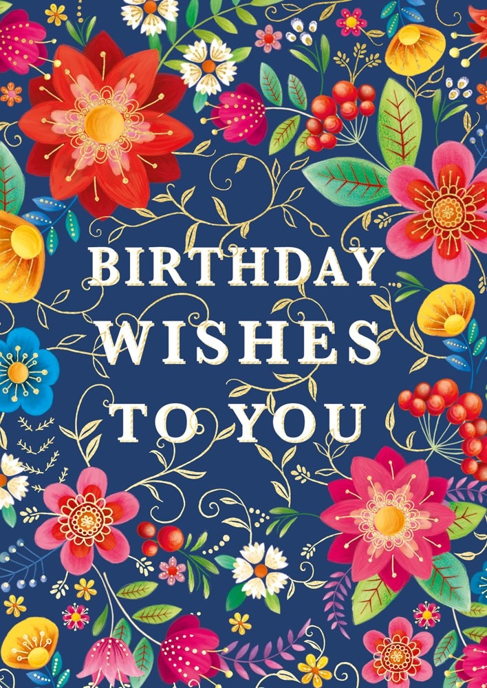 Wish someone a happy birthday with this card, featuring a riot of flowers with embellished gold foil foliage. It is blank inside for a personal message.