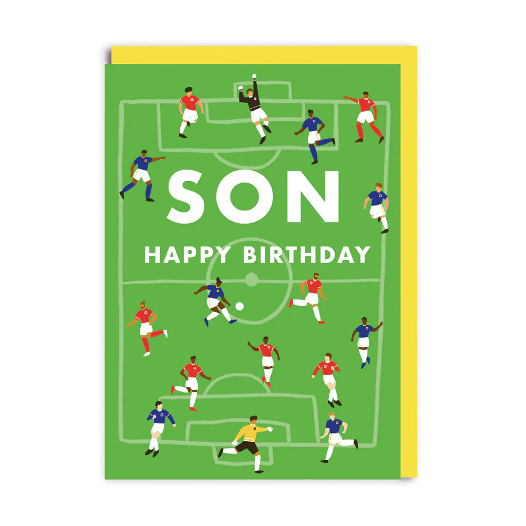 This birthday card reads, "Son happy birthday" over an image of a football pitch. It comes with an envelope and is blank inside for a personal message.