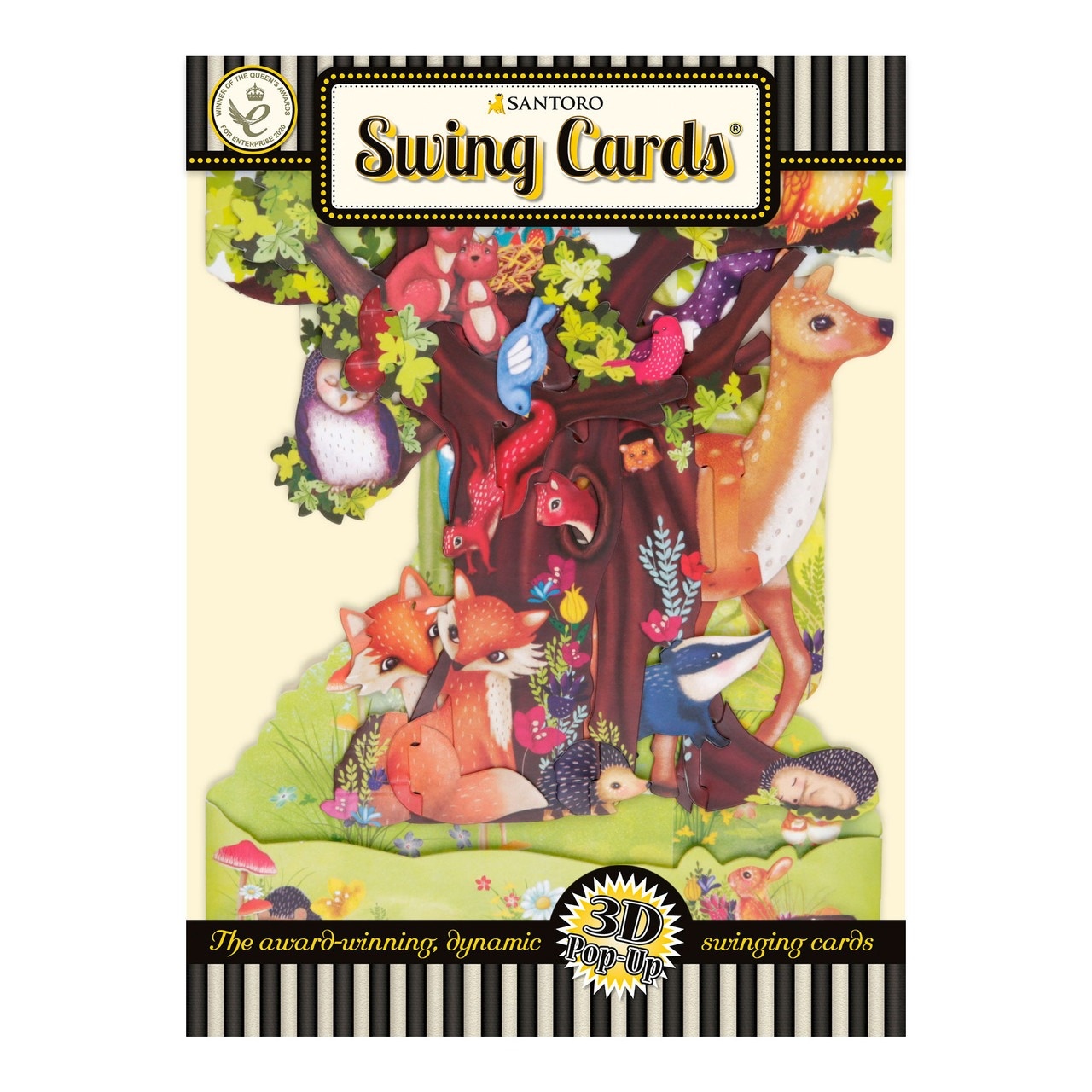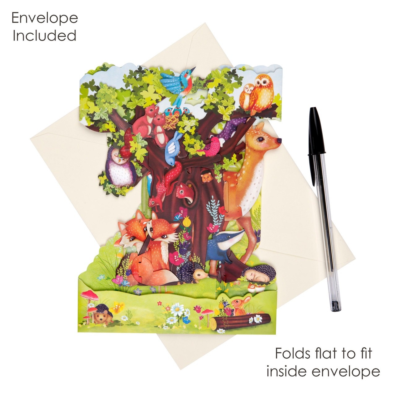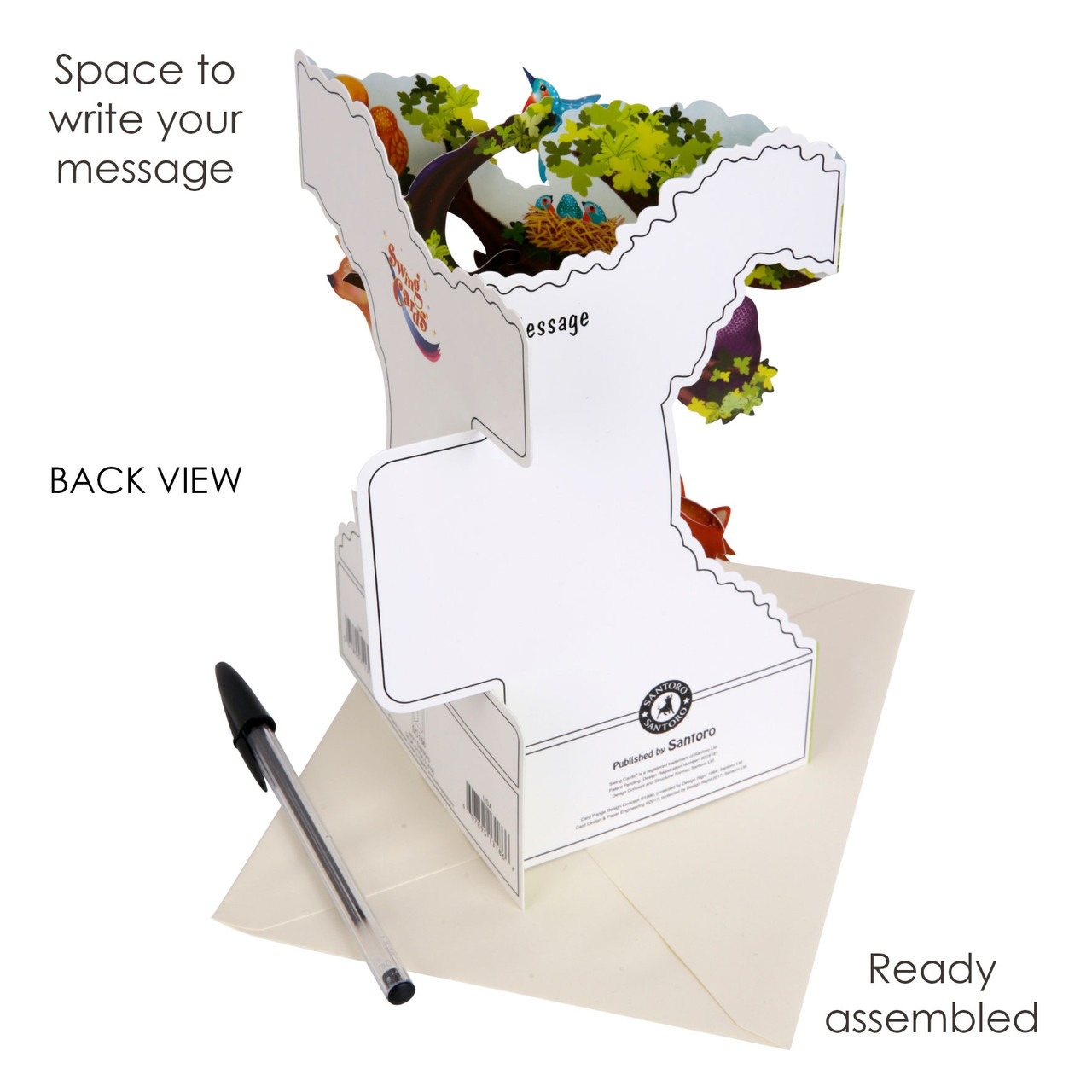 Keep things wild with this super fun Forest Animals Swing Card, featuring a riot of animals in a big tree. Ready assembled and with space for your own personalized message, this Swing Card opens to form an incredible illustration with real moving components. Folds flat into an envelope. Engineered, designed and printed in the UK.