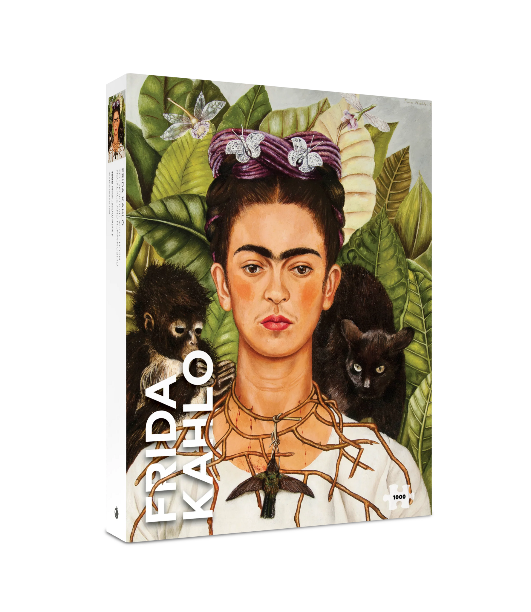 With an unflinching gaze, Frida Kahlo faces viewers in Self-Portrait with Thorn Necklace and Hummingbird. One among dozens of self-portraits, it reveals a complex individual through its layered symbolism. A monkey manipulates a veritable crown of thorns. Two flower-dragonfly chimeras hover overhead. The hummingbird, traditionally a hopeful love charm, presents as an oppressive weight when hanging from her throat—yet with its wings spread as if in flight, it echoes the sweep of the artist’s brows, her upright strength and resilience. Drawing upon motifs in Mexican culture, Aztec mythology, and Catholic iconography, Kahlo’s carefully crafted scene alludes to her own interpretation of each element, offering intensely personal references interwoven with broader views on identity, culture, resistance, and creativity.