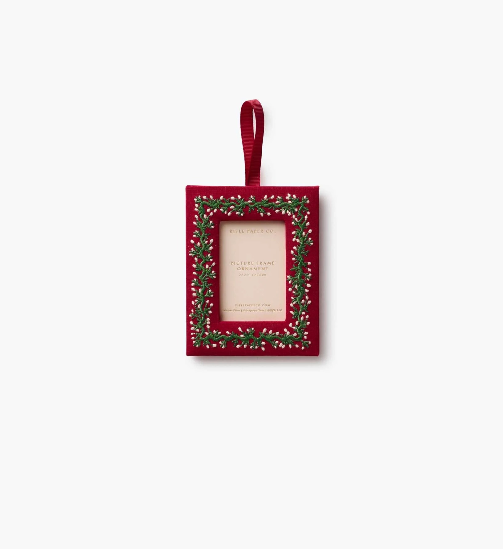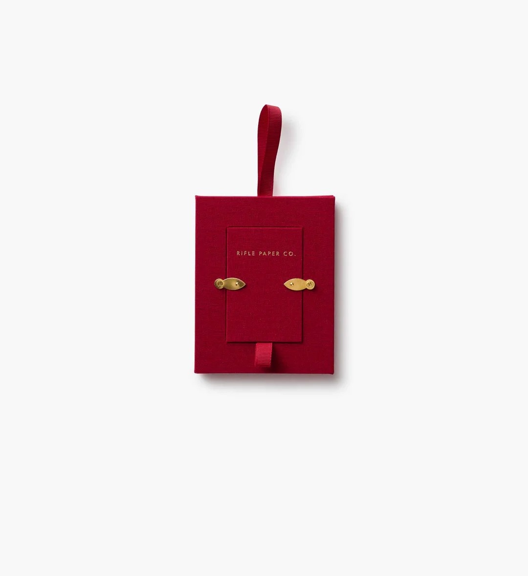 Hang a family photo or a favorite memory on this year’s tree. This bookcloth-wrapped frame features delicate embroidery and a grosgrain ribbon loop. It fits a photo that is 2" x 3".