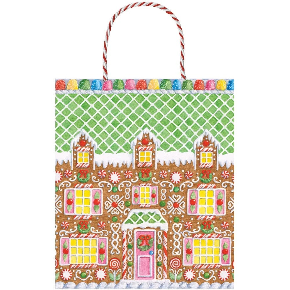 Adorned with bright colors and a festive gingerbread house pattern, this Caspari gift bag will elevate your present presentation through exceptional design and quality. It is printed on durable, heavy-duty paper and features strong handles for carrying.