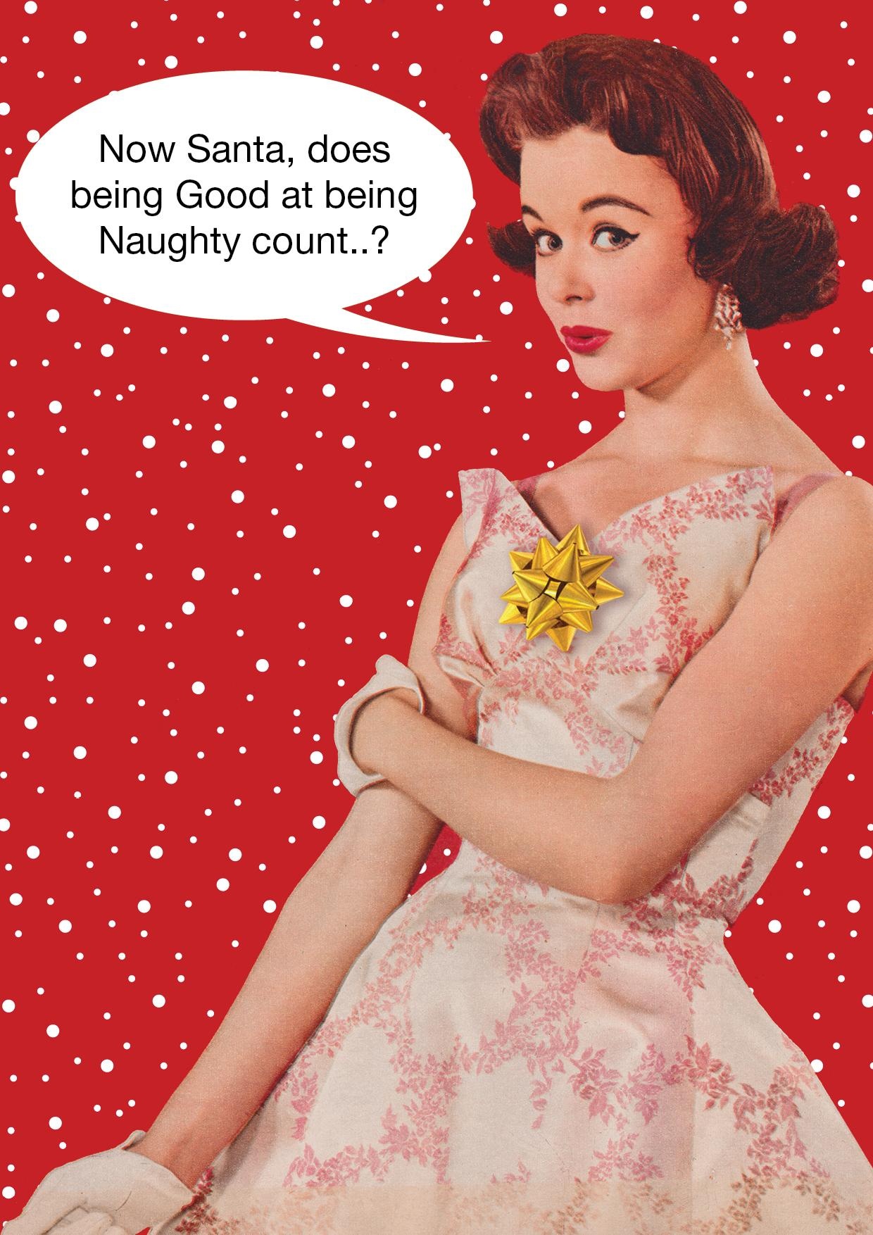 Now Santa, does being good at being naughty count…? Retro, sassy, a little twisted, and filled with that cutting British wit, this Christmas card from Kiss Me Kwik is sure to put a smile on the recipient's face. Blank inside.