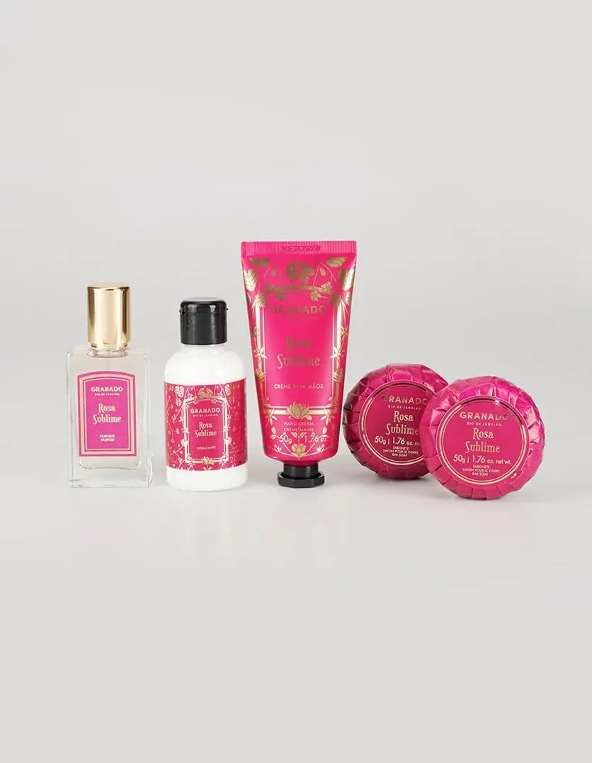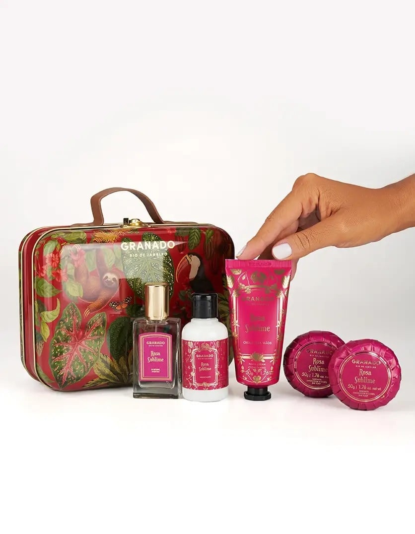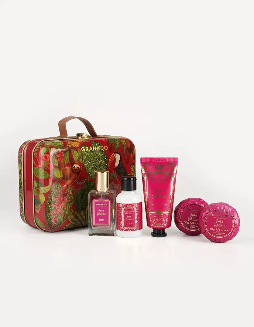 The Rosa Sublime Scented Suitcase features essential products to keep your skin soft and beautifully scented. The Rosa Sublime perfume is a celebration of one of the most important flowers in perfumery. The rich and velvety texture of its petals is enhanced by notes of saffron, amber, and sandalwood. The hand cream and body lotion are perfect for moisturizing and protecting the skin. Formulated with sweet almond oil, they deeply nourish and leave hands soft and silky. The bar soap is made from a vegetable base and enriched with murumuru butter and coconut oil, which help to hydrate, nourish, and protect the skin.