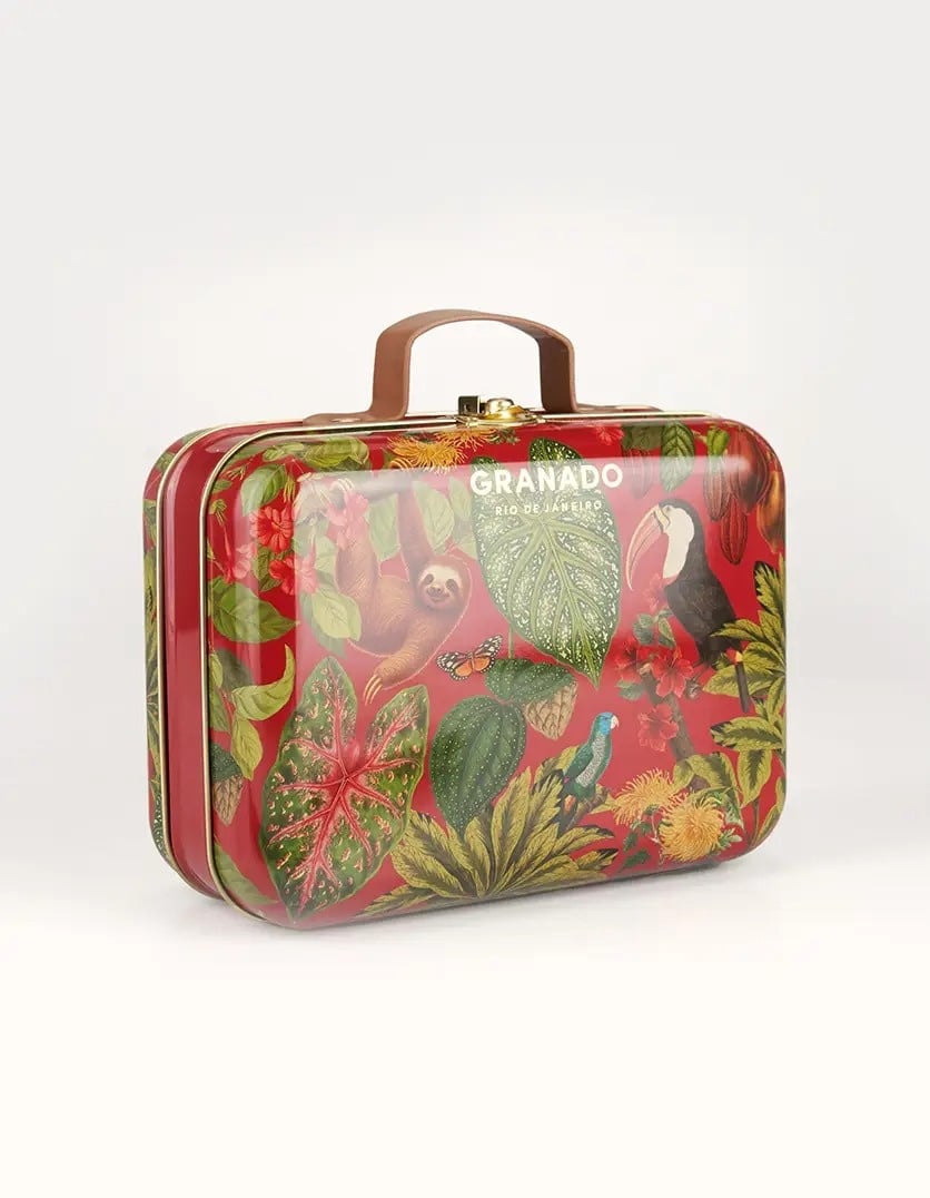 Set includes two 50g bar soaps, one 60ml body lotion, one 50g hand cream, one 25ml perfume 25ml, and one suitcase tin.
