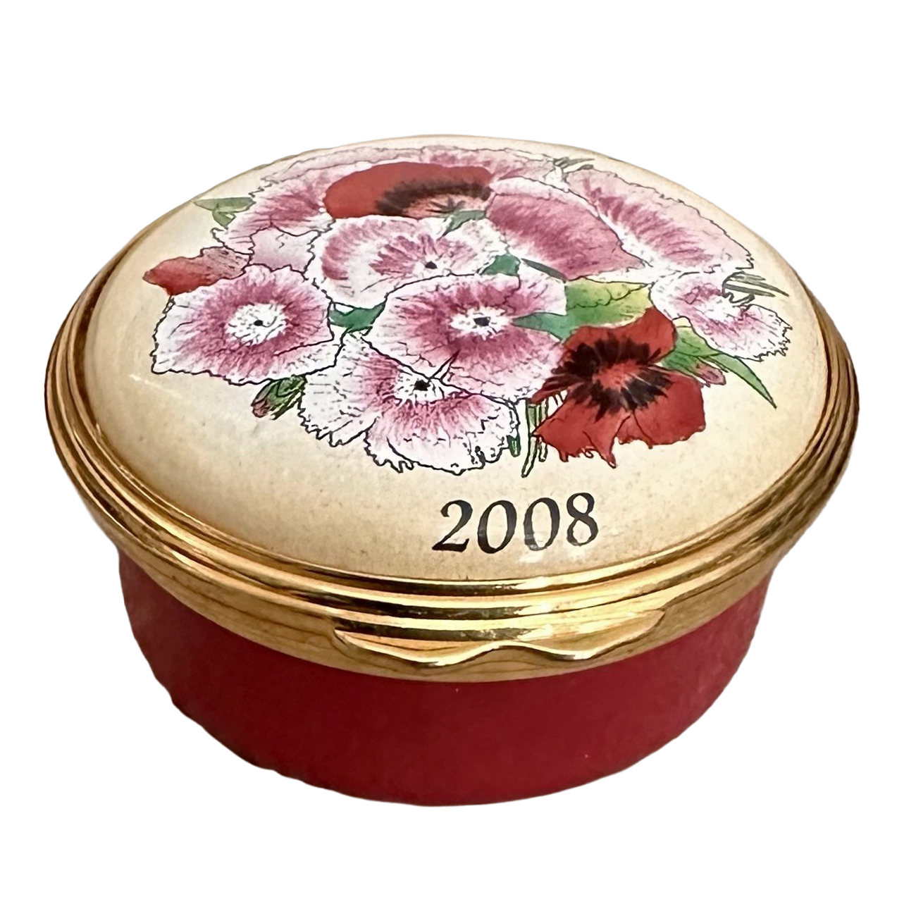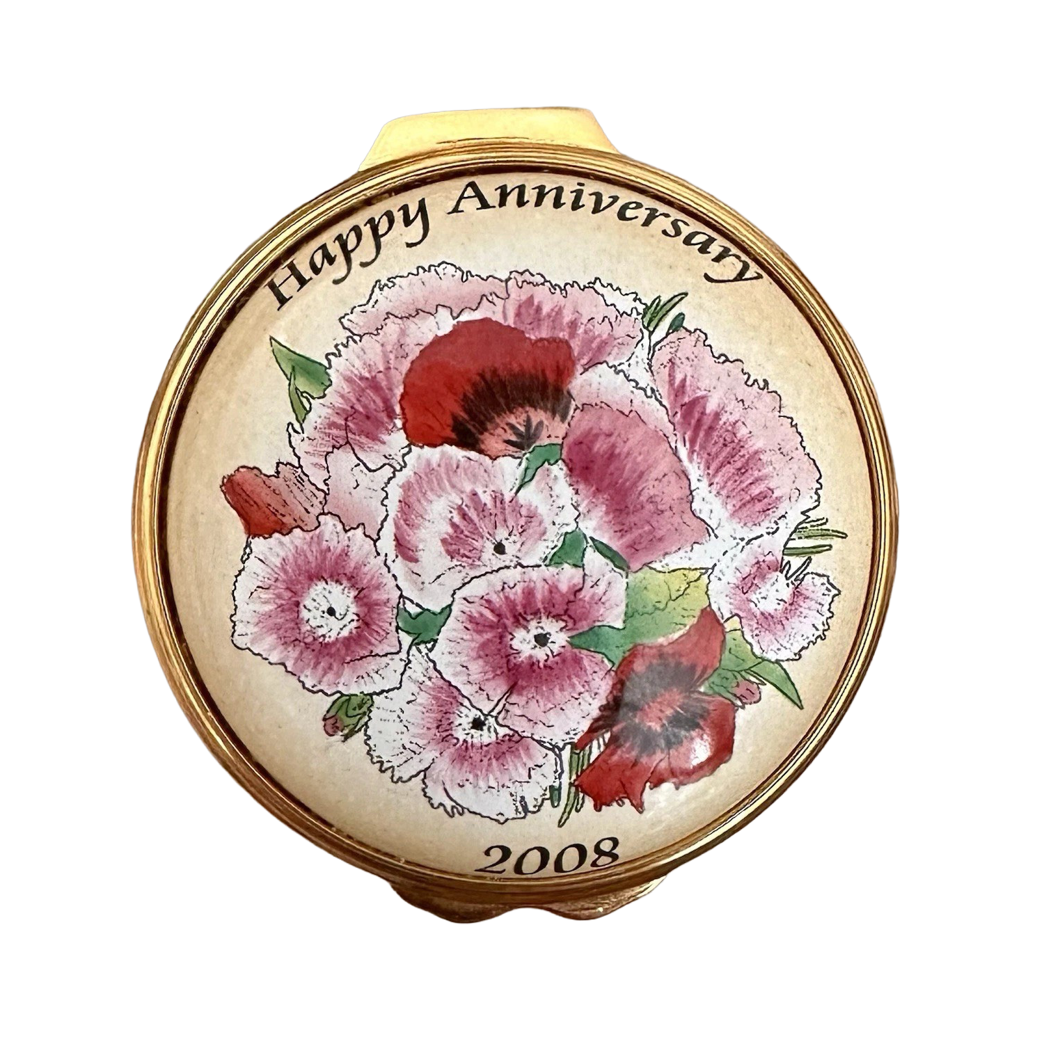 The Halcyon Days Happy Anniversary 2008 Enamel Trinket Box is a collectible perfect for celebrating special anniversaries. Made of enamel, this trinket box features the brand's signature style and charm.