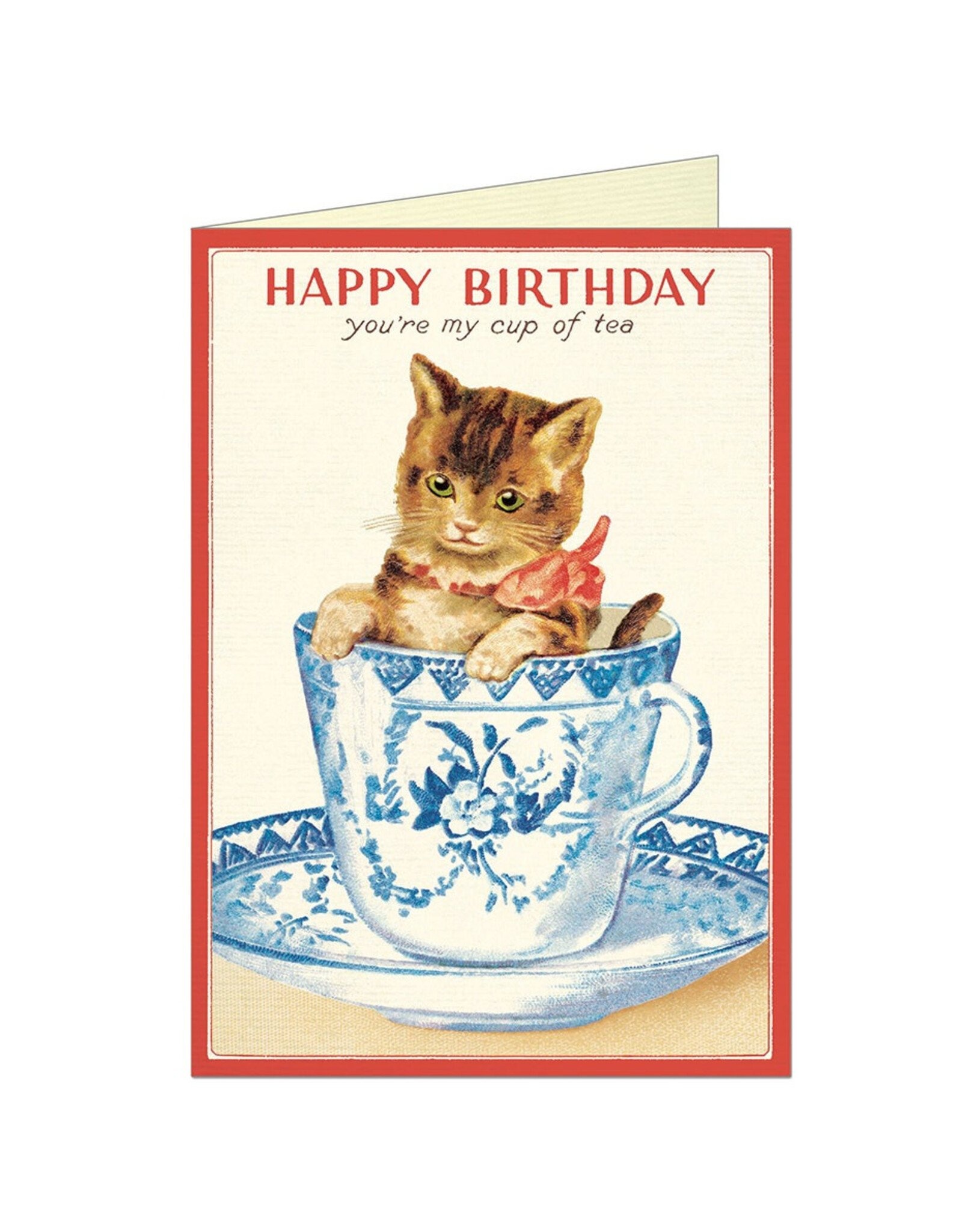 The "You're My Cup of Tea" greeting card features a charming vintage illustration of a kitten nestled in a blue and white teacup. Printed on high-quality, Italian paper, this 4" x 6" card is blank inside for personal notes and includes an envelope.