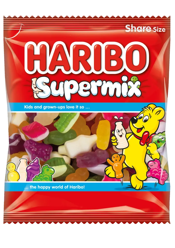Smooth, Creamy and Squishy, Haribo Supermix combines its squishy and soft textures with creamy and fruity flavors in a mix of much-loved pieces: Jelly Man, Milk Bottle, Sheep and Ice Cream.