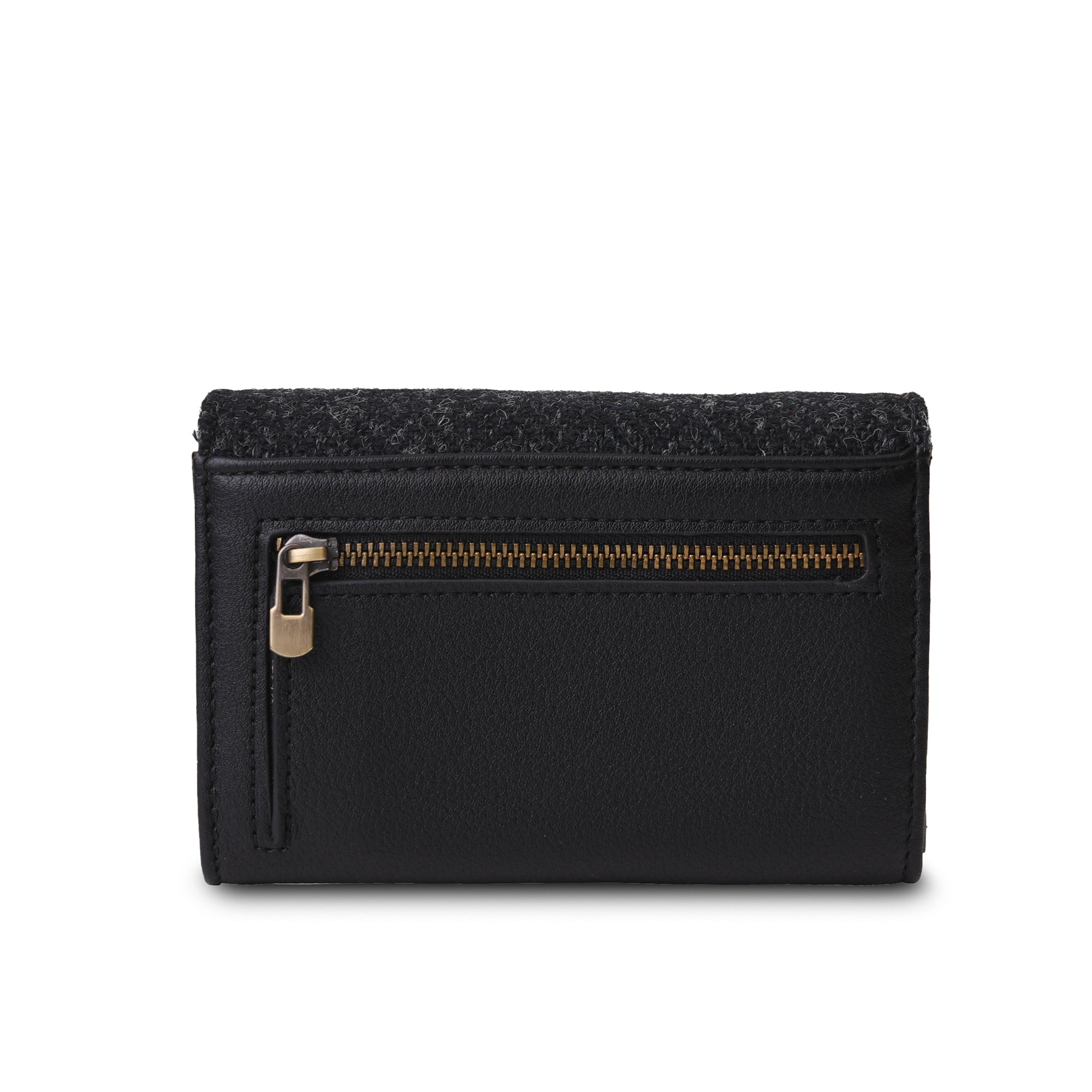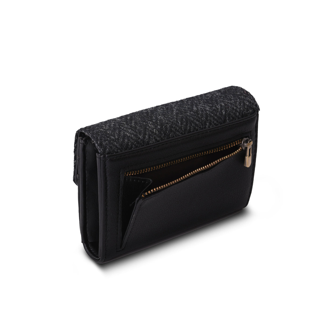 The Islander UK Small Clasp Purse showcases an exterior crafted from Harris Tweed Black Herringbone wool cloth and vegan leather for a distinctive touch. Elevate your style and organization with The Small Clasp Purse — where fashion meets functionality. It has 2 card slots, an inner pouch, a zipped compartment, an outer zip pocket, and a snap closure.