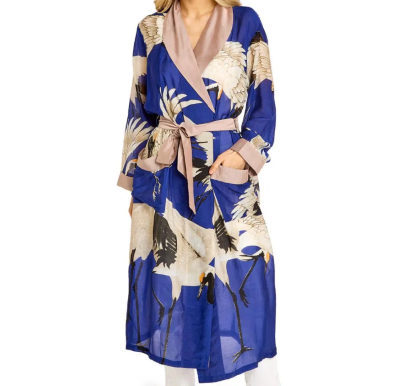 The One Hundred Stars Robe Gown in the cobalt heron pattern is made from a custom blend of modal and cupro which creates a silky smooth lightweight material. This lightweight design falls to an elegant long length and features a fold over collar, complete with self-tie waist belt and front patch pockets. This gown is perfect to lounge around the house in style or for layering as a chic accessory to your favorite outfit.