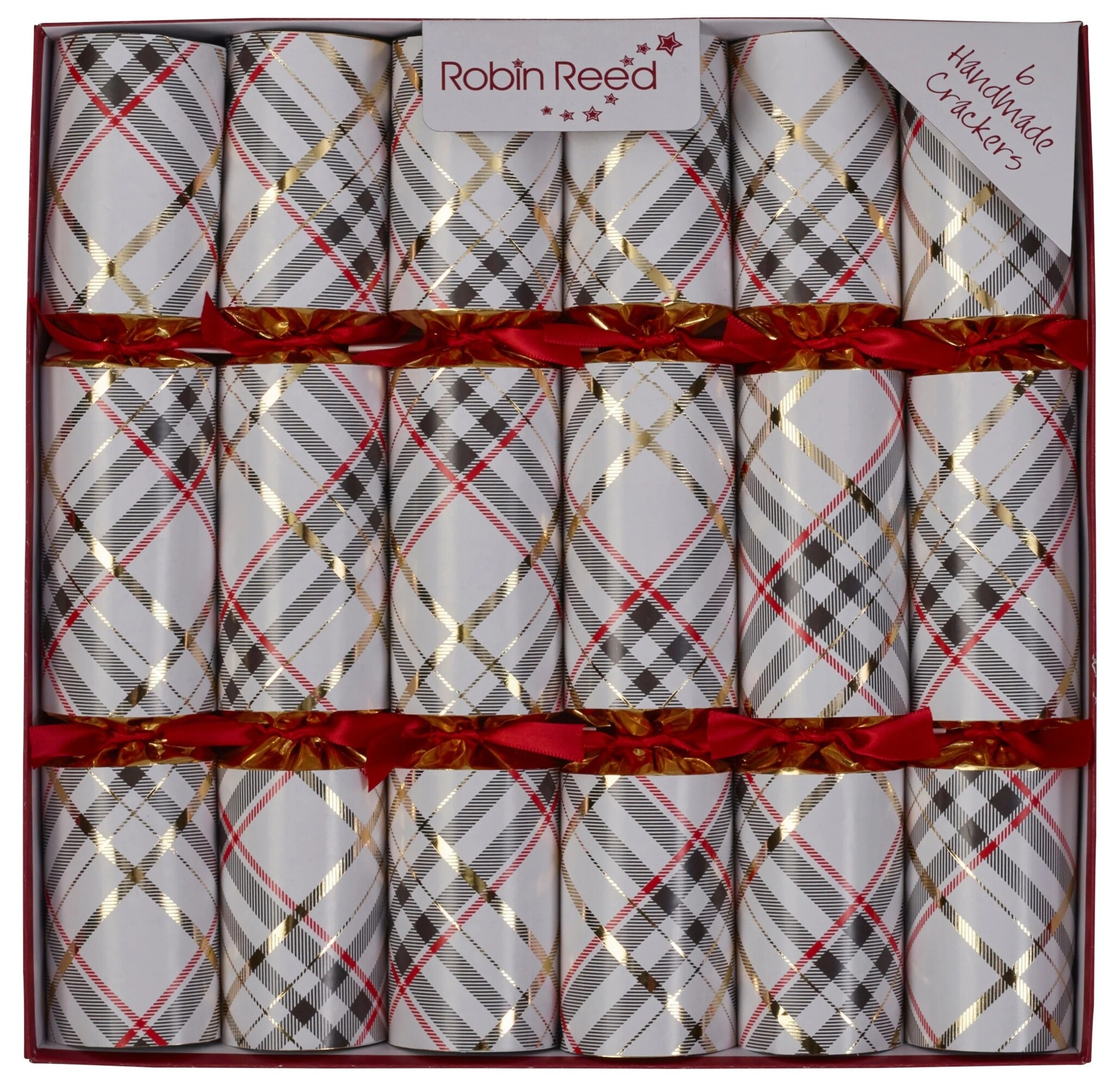 Robin Reed Highland Fling Christmas Crackers are traditional, handmade English Christmas crackers featuring a decorative tartan design, complete with party favors inside. Pull apart with a friend to reveal a bang, a paper crown, a joke, and a small trinket.
