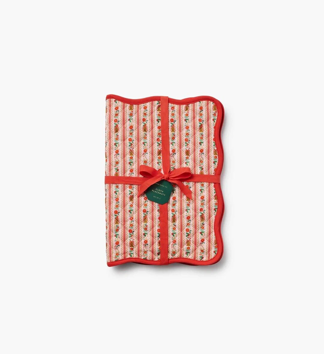 Add something special to your holiday table with this set of four quilted, reversible placemats, featuring festive Holly Jolly illustrations and a contrasting scalloped edge. Machine wash cold separately. Tumble dry low. Warm iron on back if needed.