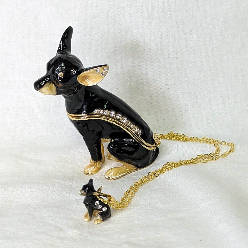 Finished in a vibrant enamel and accentuated with lively Austrian Swarovski crystals, this black and tan Chihuahua is a perfect gift for everyone. Inside the box is a mini matching figurine on a 20 inch chain.