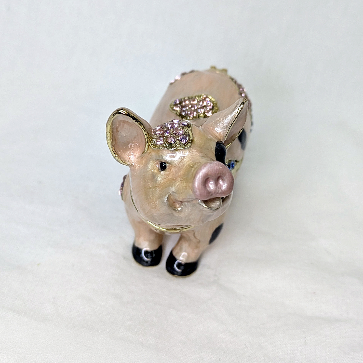 Finished in a vibrant enamel and accentuated with lively Austrian Swarovski crystals, this pig is a perfect gift for everyone. Inside the box is a mini matching figurine on a 20 inch chain.