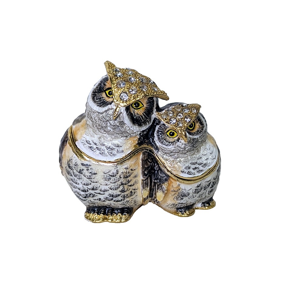 Finished in a vibrant enamel and accentuated with lively Austrian Swarovski crystals, this pair of owls is a perfect gift for everyone. Inside the box is a mini matching figurine on a 20 inch chain.