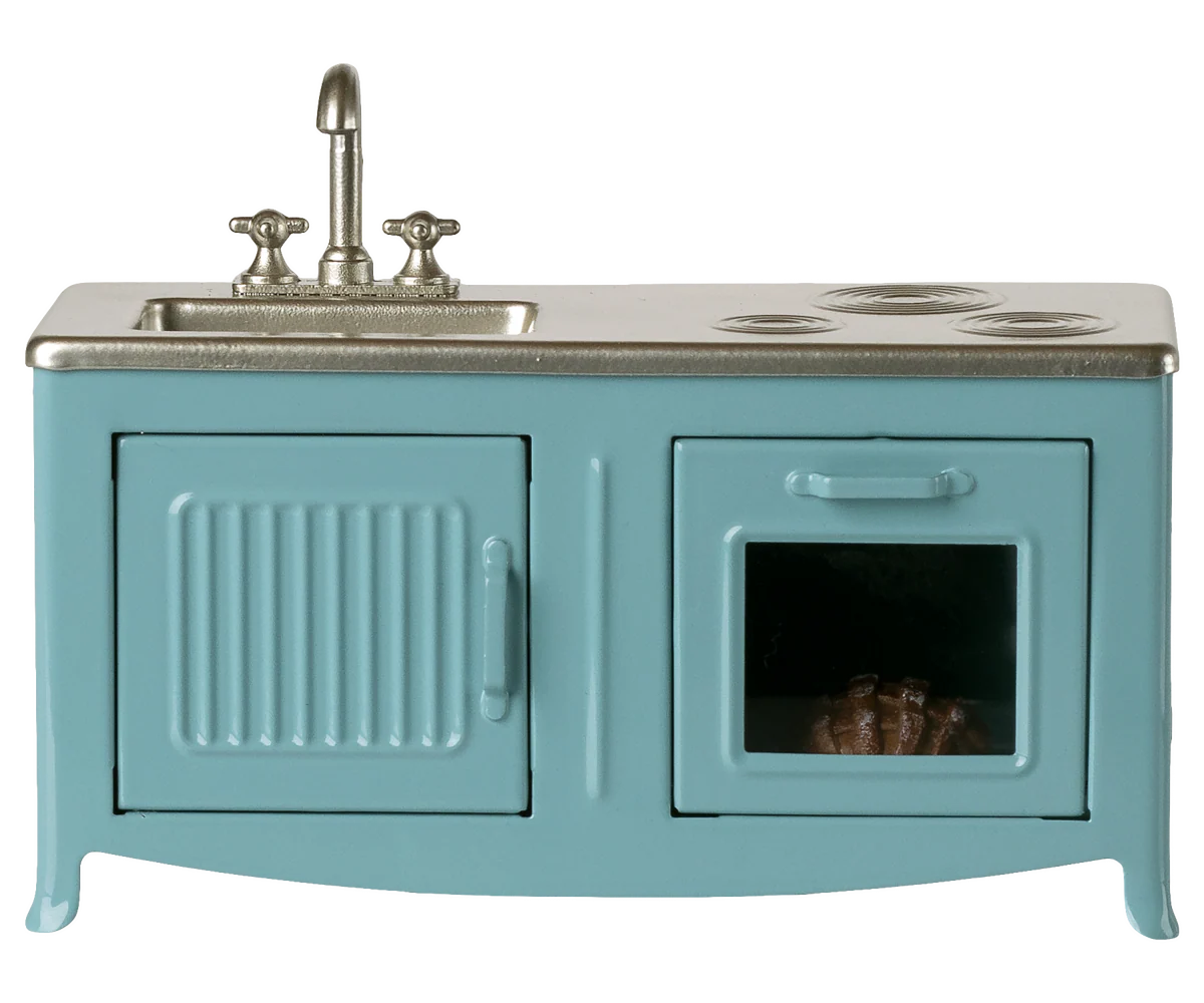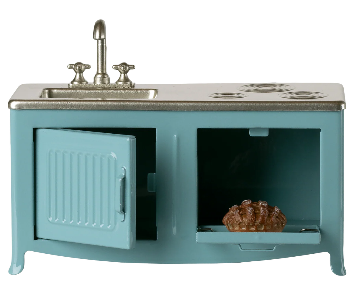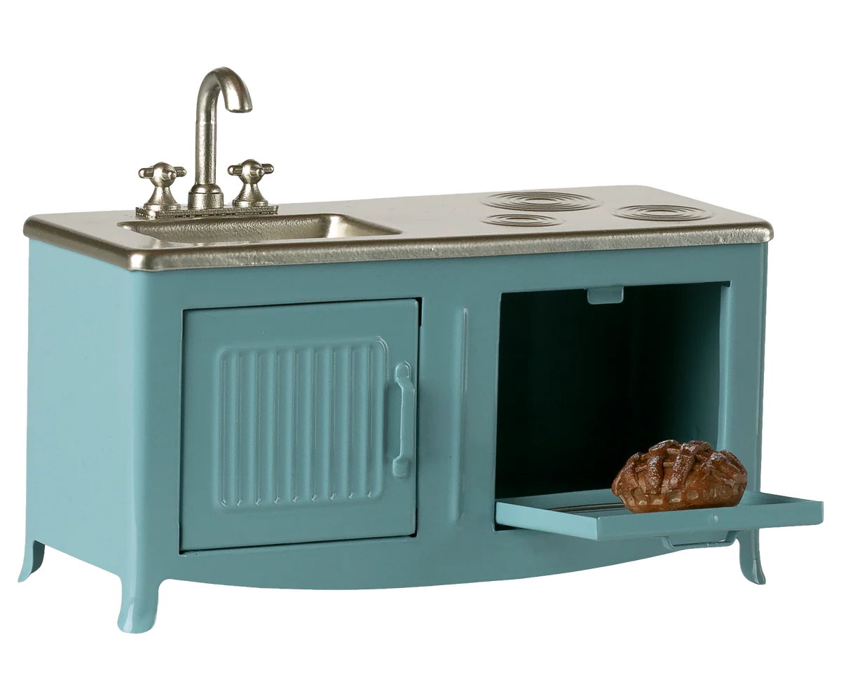 The heart of every home is the kitchen. This metal kitchen has a beautiful color tone and has many playful details such as a cabinet door, sink and an oven with a freshly baked pie. It is a perfect size for the mouse family.
