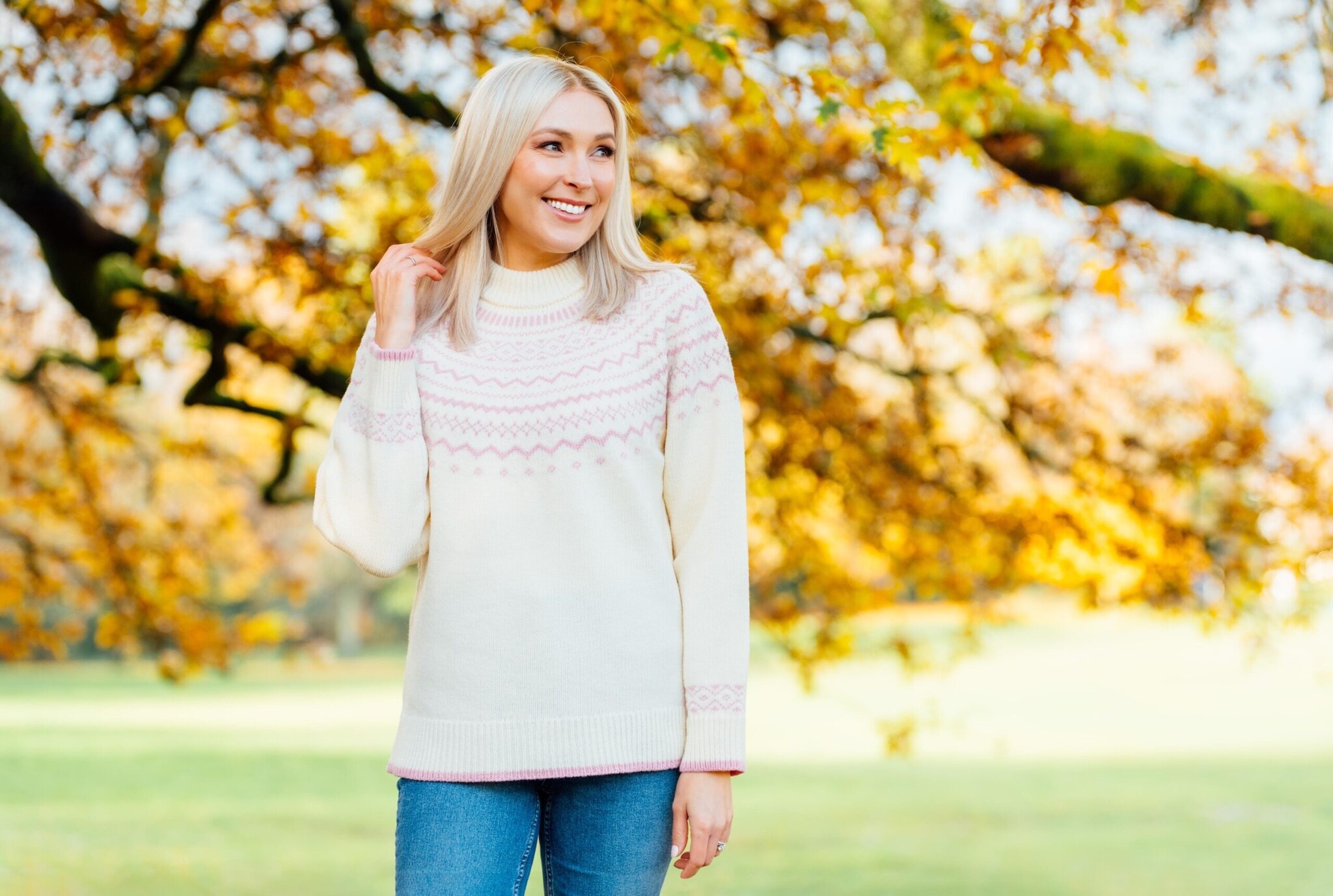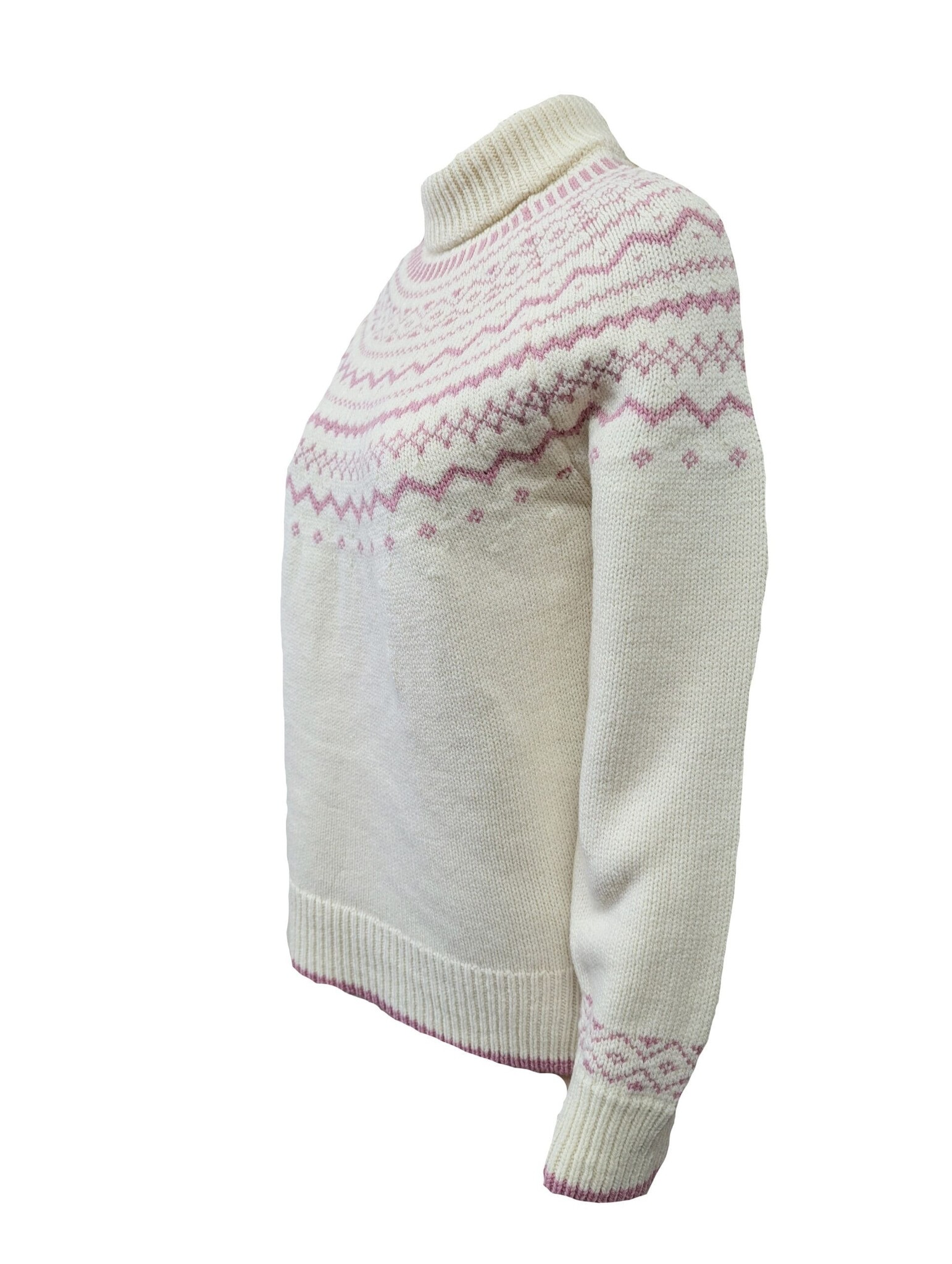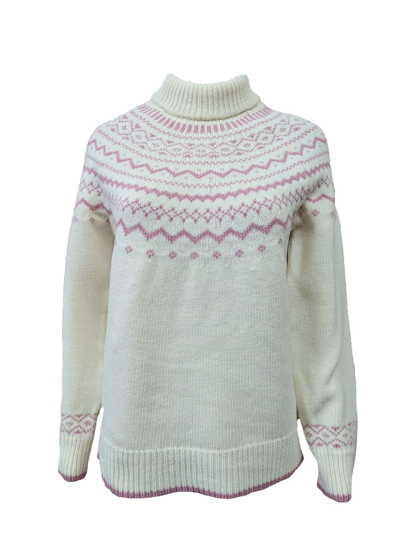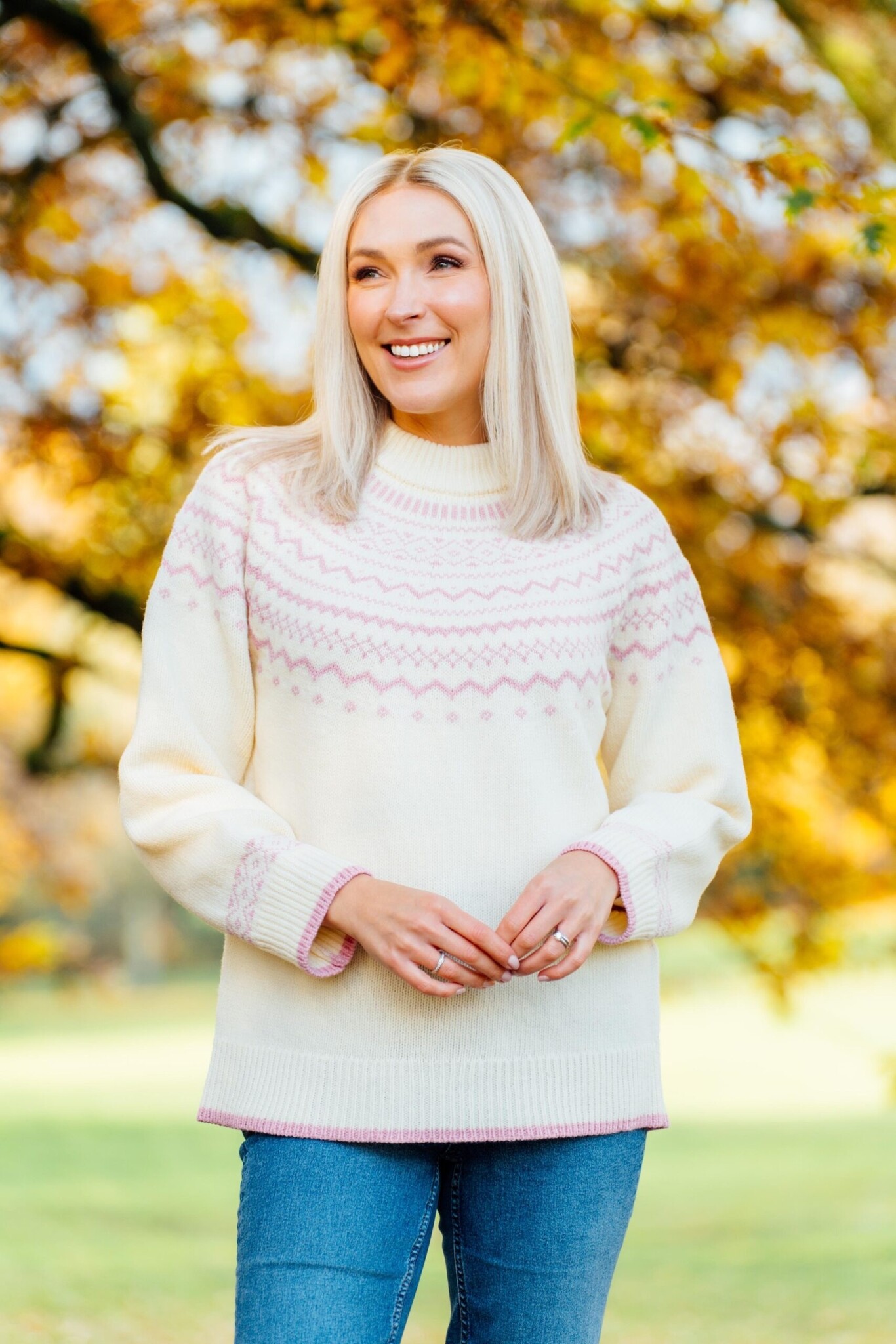 Expertly knitted from 100% premium Merino wool and with a thick collar, this luxuriously soft and warm ladies’ crew neck features a classic Fair Isle pattern that brings a sense of timeless charm to any wardrobe. It showcases intricate detailing on the cuffs and hem for a refined, distinctive finish. It’s a perfect blend of traditional craftsmanship and modern design.