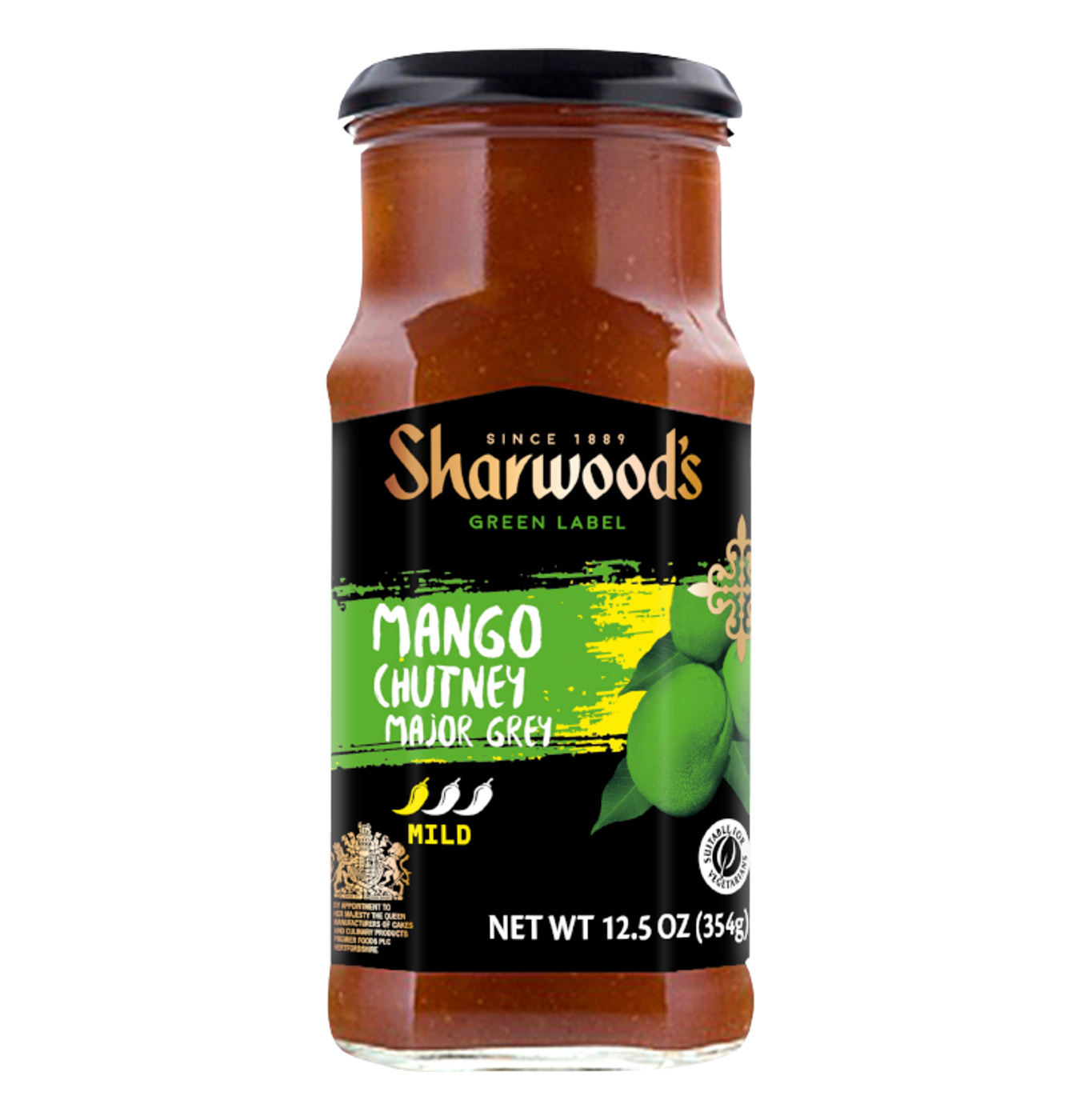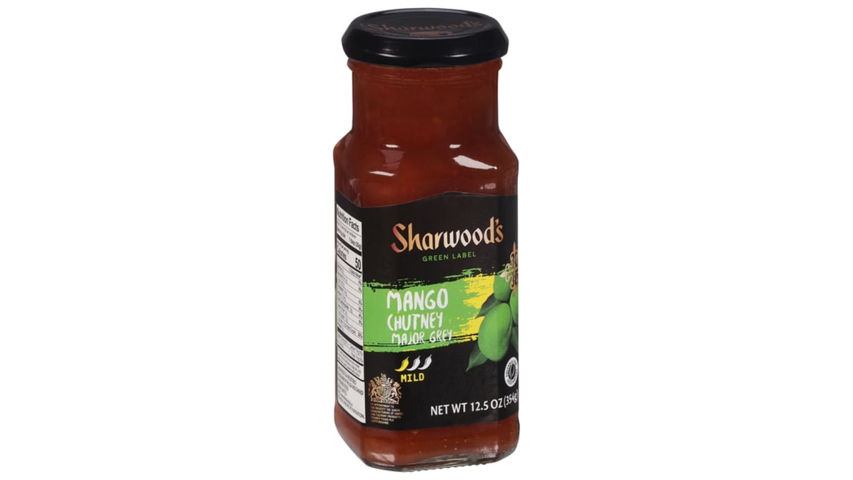 Sharwood's Major Grey Mango Chutney is a thick, mild, and fruity condiment made from sweet mangoes and a blend of savory spices, offering a sweet and tangy flavor profile that is popular with curries, poppadoms, and cheese boards.