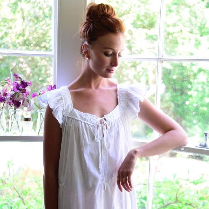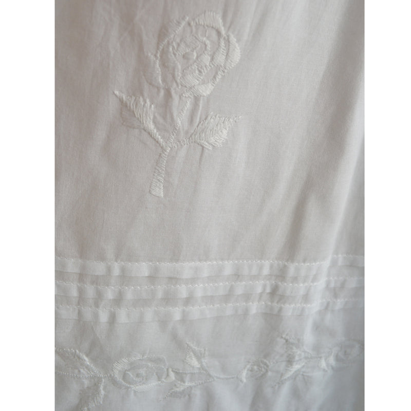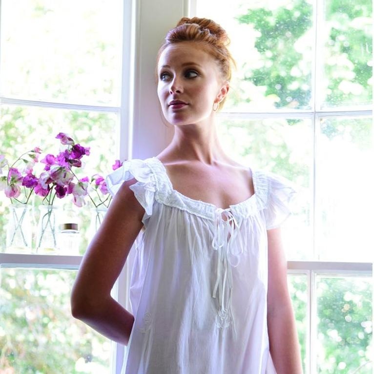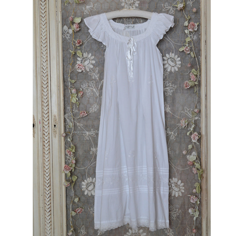 This delightfully feminine nightdress is delicately embroidered with white roses strewn on the skirt and has a decorative band between two sets of pin–tucks above the hem. The light and comfortable nightgown features delicate flutter sleeves, and the beautifully shaped neckline is edged with ruffles and finished with a ribbon tie. The gown is full length with a relaxed fit.