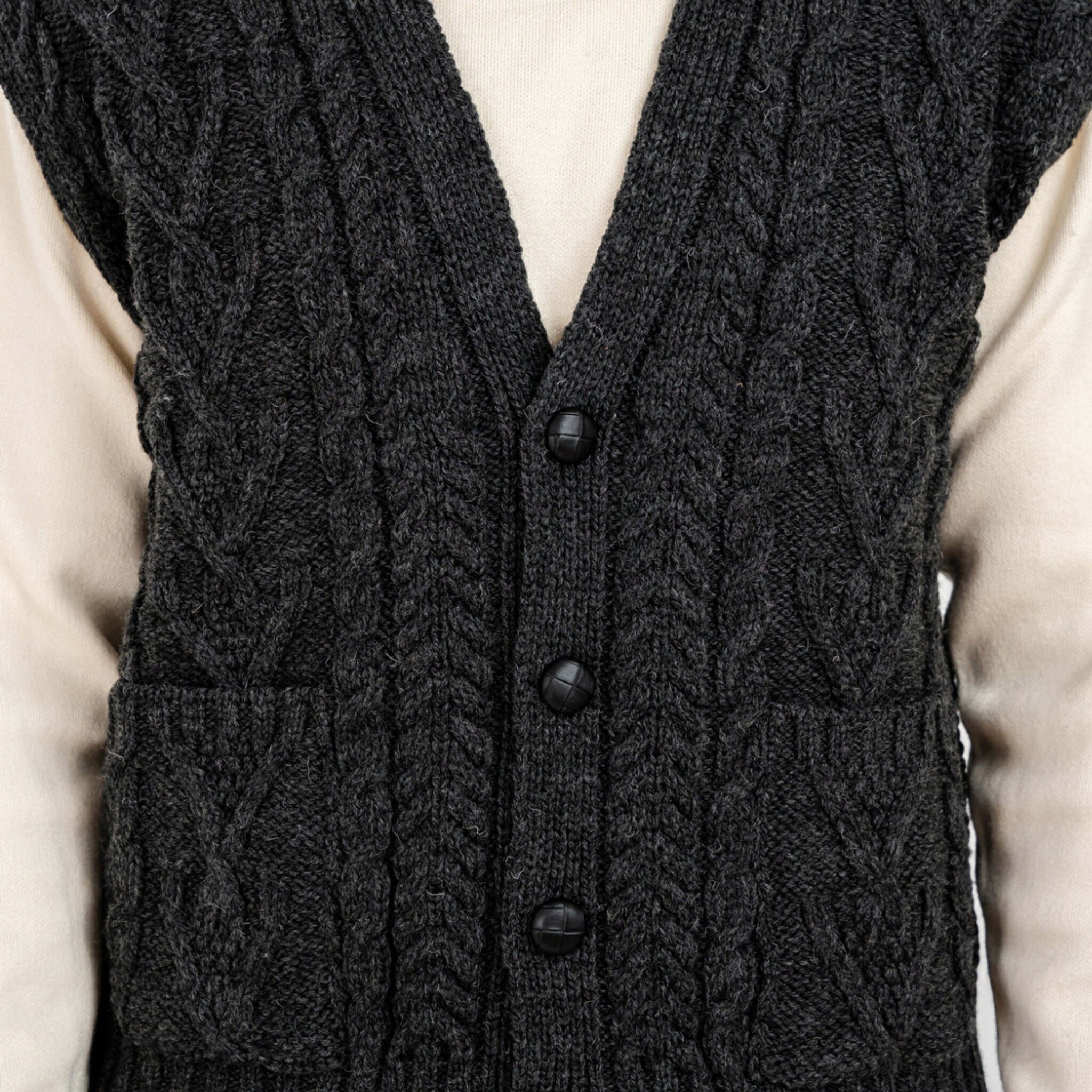 For a one-of-a-kind winter accessory that offers enough versatility for you to quickly transform your everyday looks, this Men's Aran Sleeveless Cardigan in Charcoal is a must-have addition to your wardrobe. Crafted from 100% Merino wool, this piece is just what you need to stay warm outside in the harsh cold, and it is also breathable, keeping you comfortably dry. The sleeveless, v-neck design of the cardigan makes it great for showing off layered looks, while the front pockets add chic style. The brown football buttons fastening the front not only add great contrast with the wool but also allow the cardigan to be worn open or closed for style adaptability.