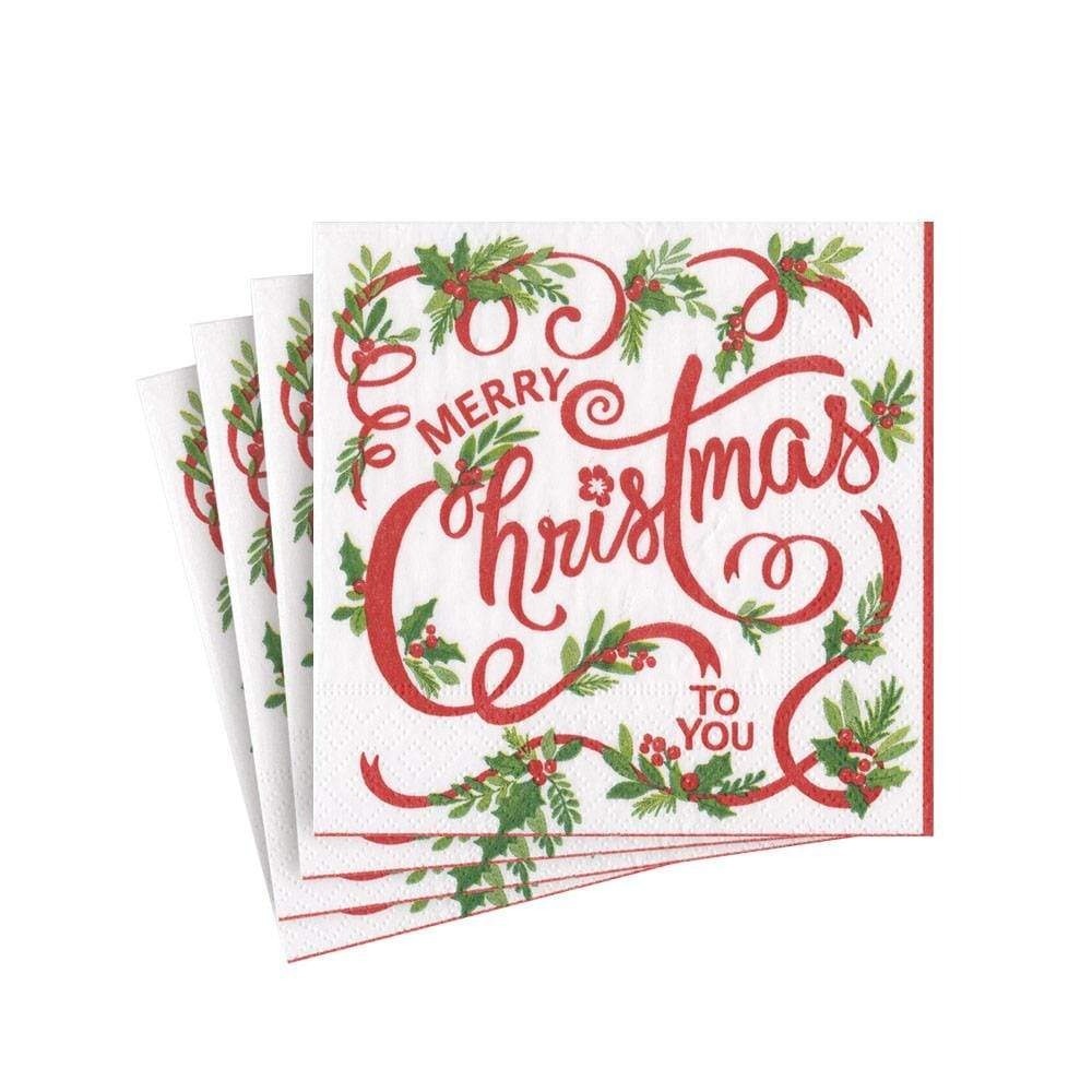 Bring Christmas into your home with these holiday paper cocktail napkins wishing you a merry Christmas. Each is made of triple-ply tissue and printed in Germany with non-toxic, water-based, food-safe ink. They are made using environmentally-conscious raw materials, which ensures they are both biodegradable and compostable.