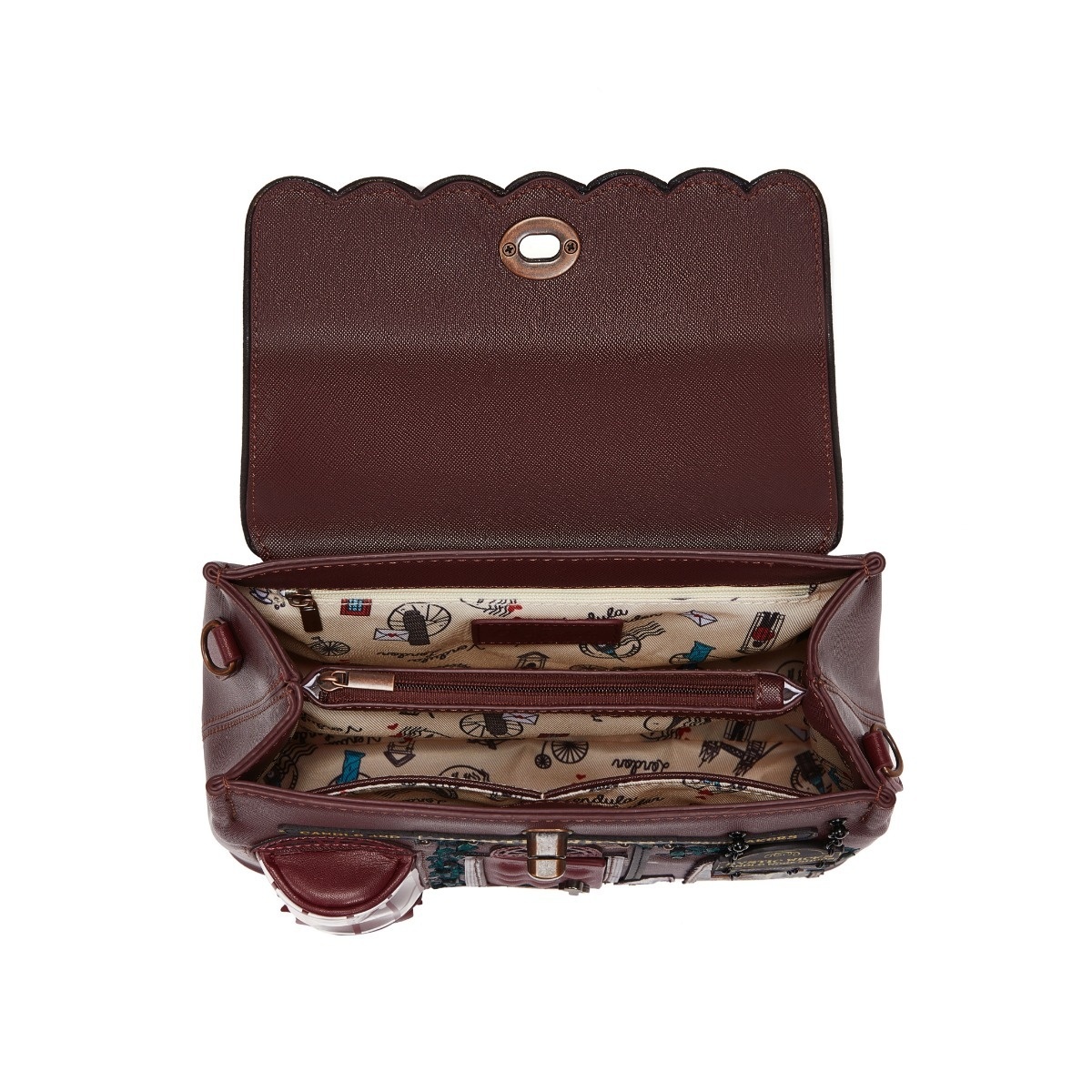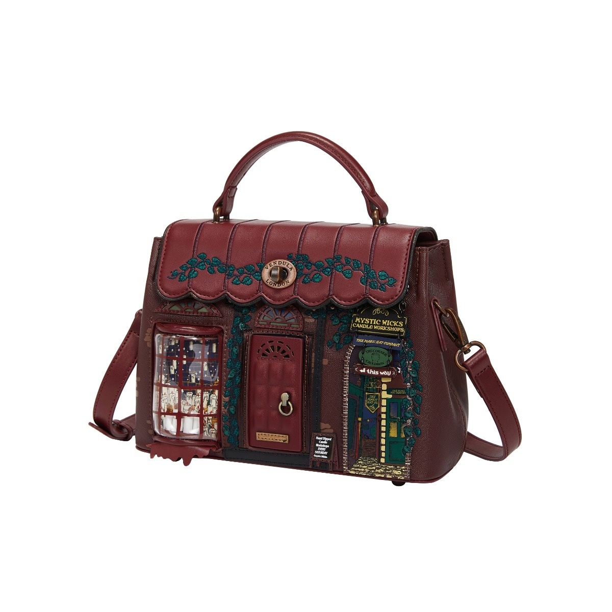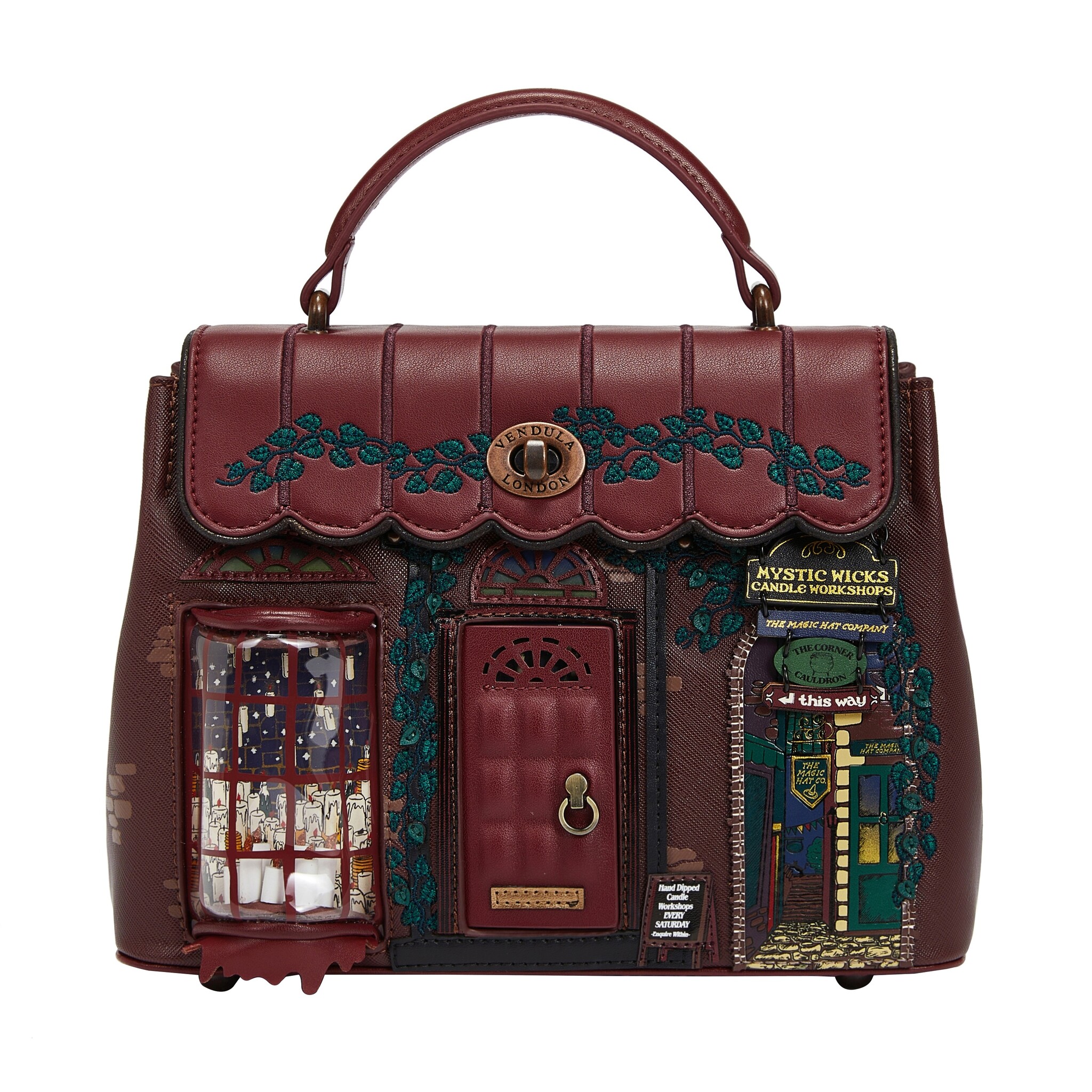Small in size but mighty in style, the Mystic Wicks Candle and Wandmakers Mini Grace Bag is perfect for your daily or occasional outings. Made from vegan leather and finished with elegant copper hardware, it’s a compact version of Vendula's Grace Bag but with just as much wow factor. Base studs ensure stability, while the shopfront artwork, with its magical candle and wand motifs, adds charm and whimsy to any ensemble.