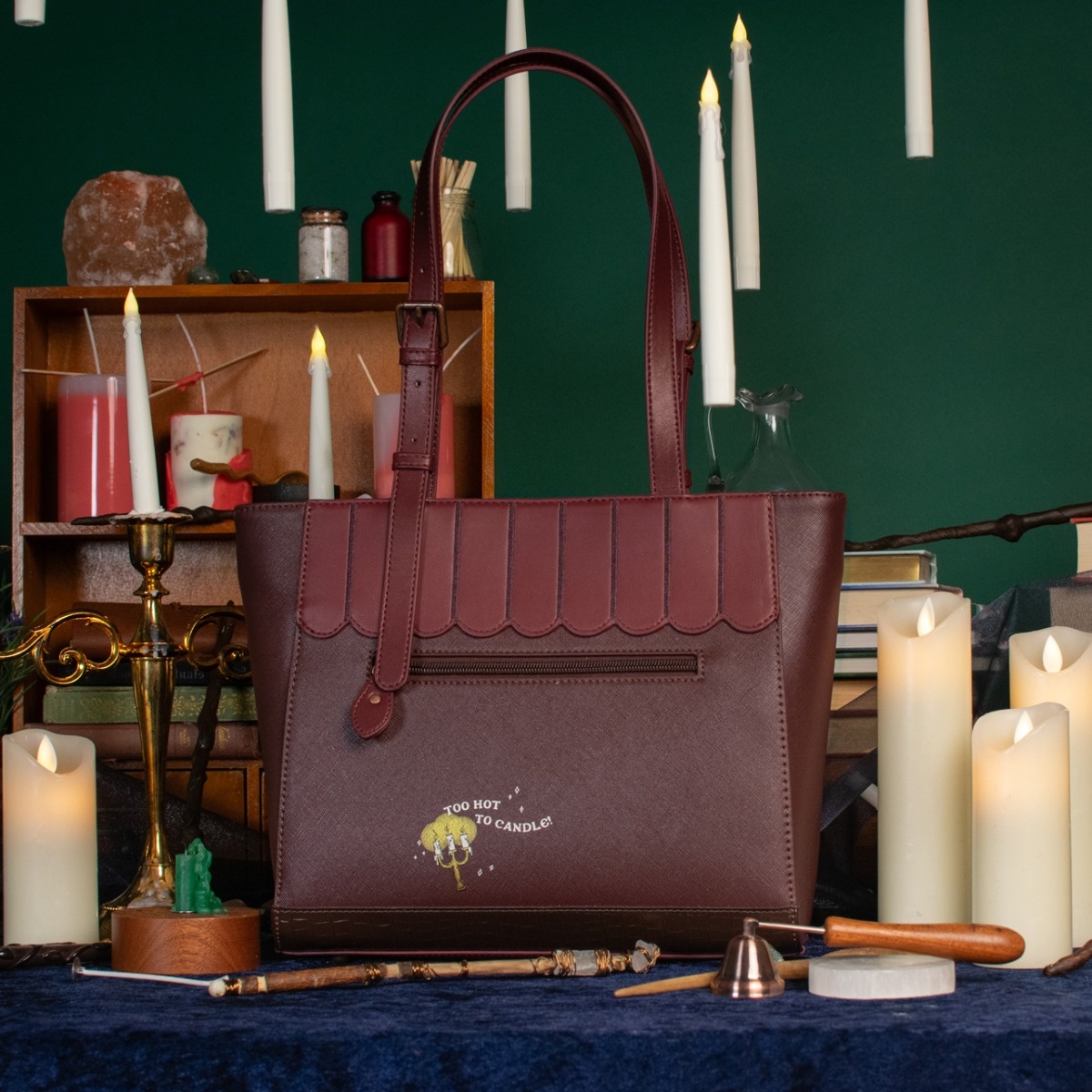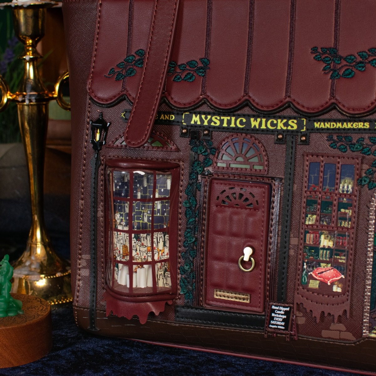 Love spell books and all things mystical? Then the Mystic Wicks Candle and Wandmakers Shopper Bag is your dream come true! This spacious vegan leather bag features copper hardware and adjustable shoulder straps for optimal comfort. Ideal for work, study, or everyday essentials, it’s adorned with printed and appliqué artwork featuring a magical doorway, levitating candles, and a mysterious alleyway. Style, comfort, and sorcery—all in one!