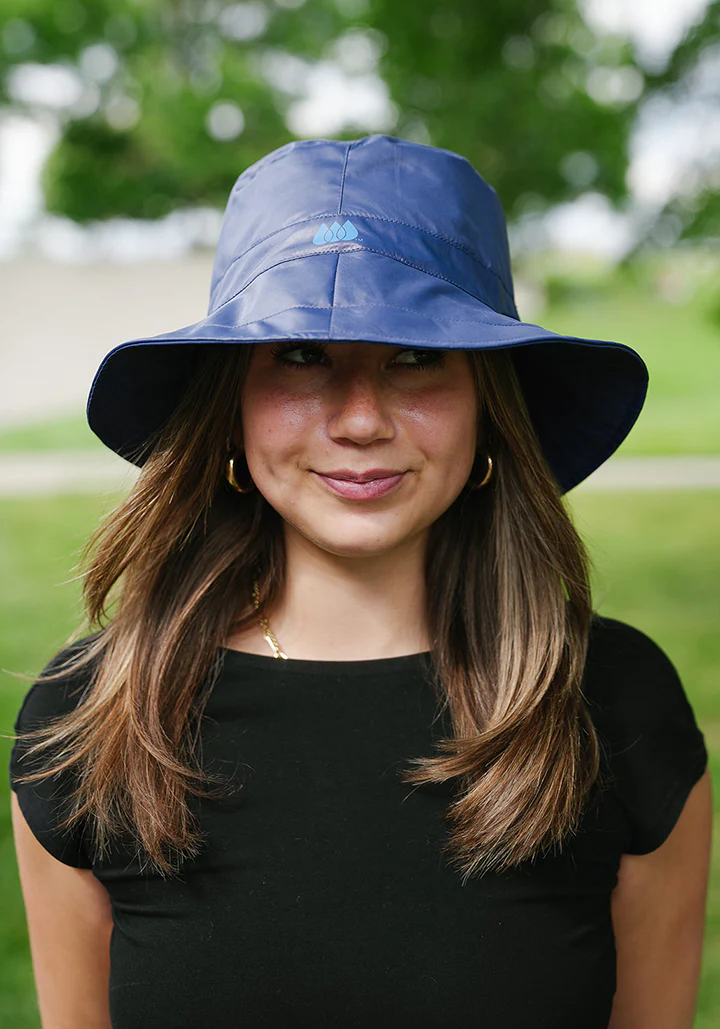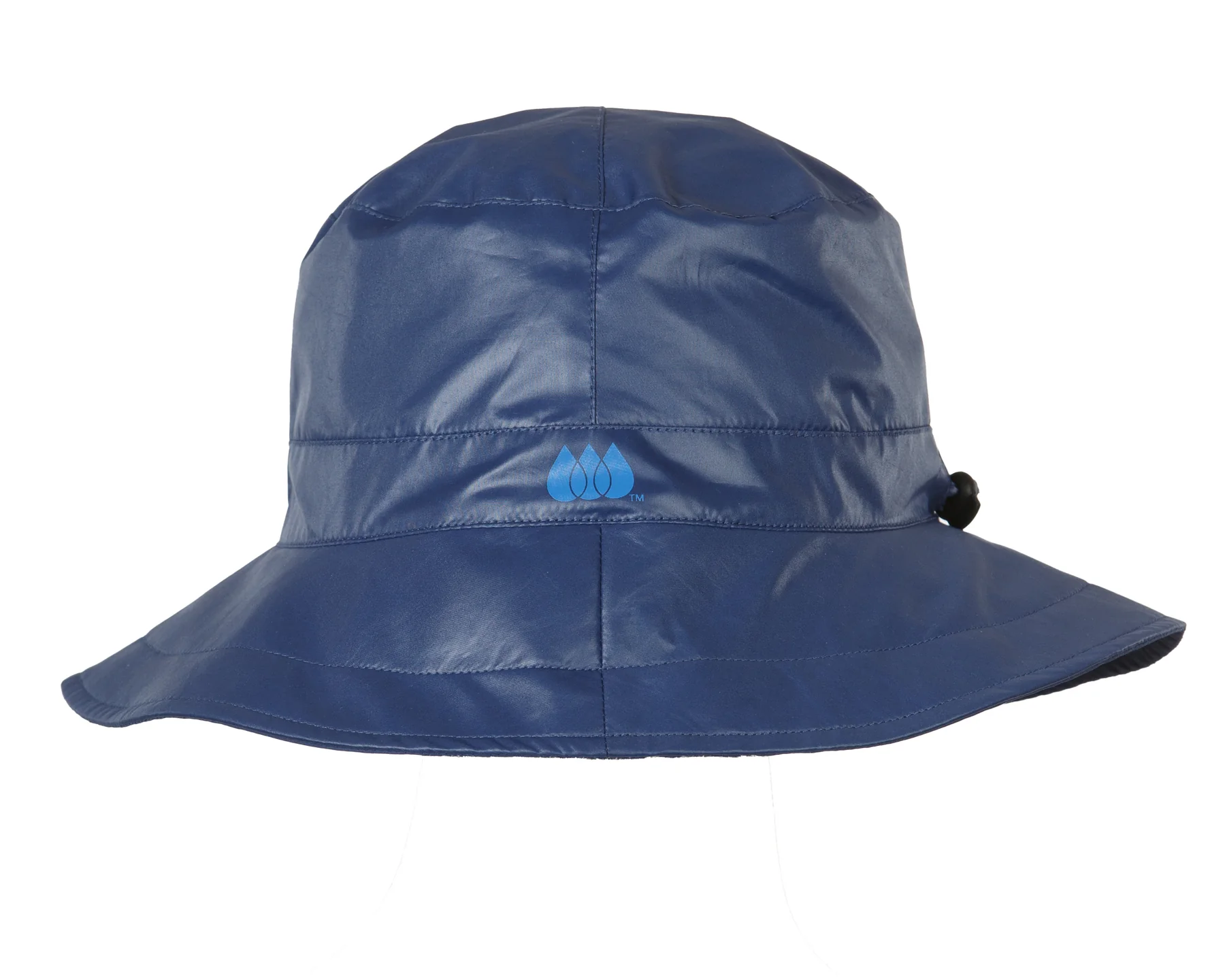 This navy blue rain cap is a reversible, water-repellent, light weight bucket-style rain hat that has an adjustable toggle strap. One size fits most. Brim width is 3", height from brim to crown is 8" and inner circumference is approximately 23"-23 1/4".