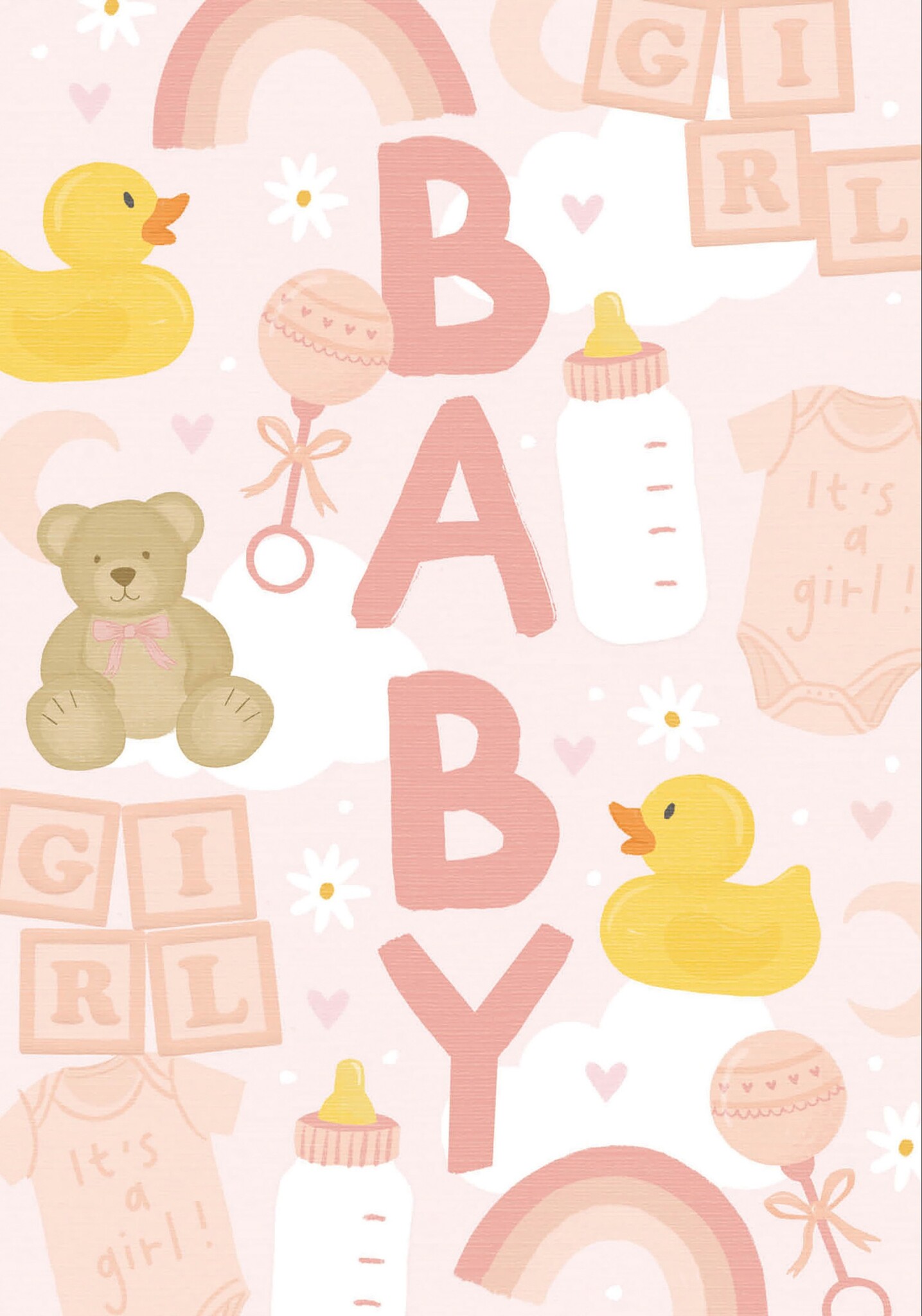 This card features a scattering of baby-related objects on a background of pale pink. The message inside reads, "Congratulations on the birth of your little girl".