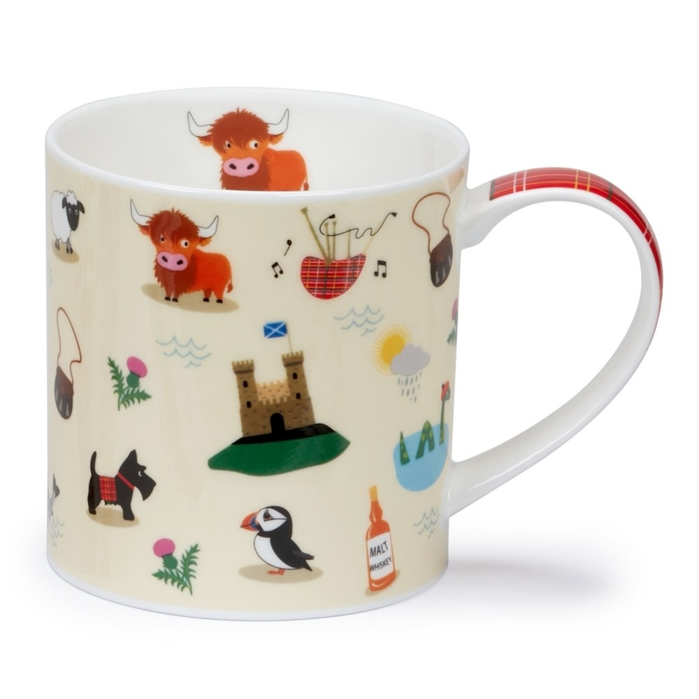 This fun and charming design features many famous icons of Scotland on a cream background.