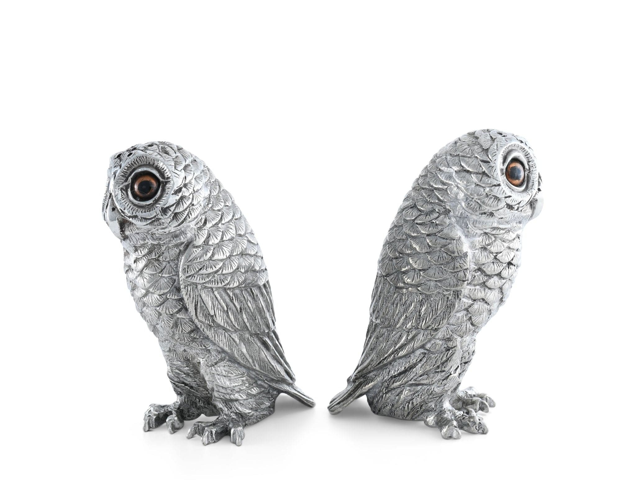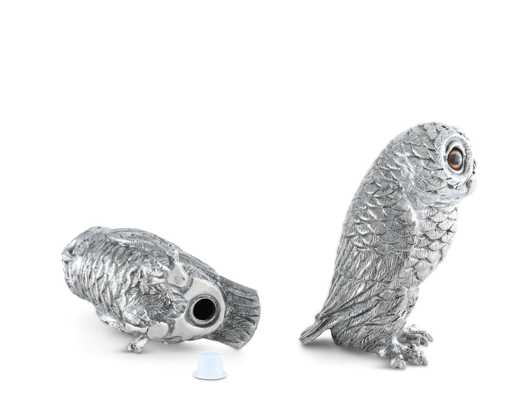 The Vagabond House Owl Salt & Pepper Set features two intricately detailed, handcrafted pewter owls. These whimsical shakers feature amber-colored eyes and realistic feather texture, designed as functional, heirloom-quality table decor. Hand wash in warm water, use mild non-acidic soap. Rinse, dry completely.