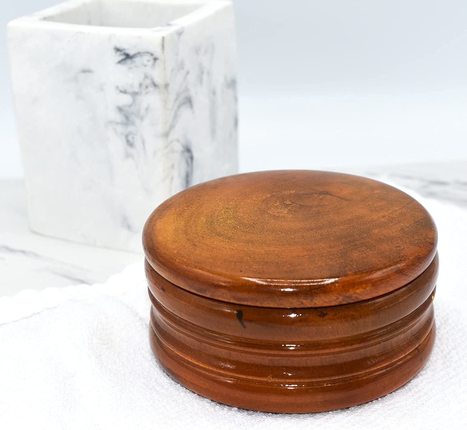 Hand carved from genuine light mango wood. Bowl is varnished/sealed for long life. The exterior dimensions of the closed bowl are approximately 3.75" wide and 1.8" deep. The interior dimensions are approximately 3.2" wide and 1.00" deep. Ideal for shaving soap.