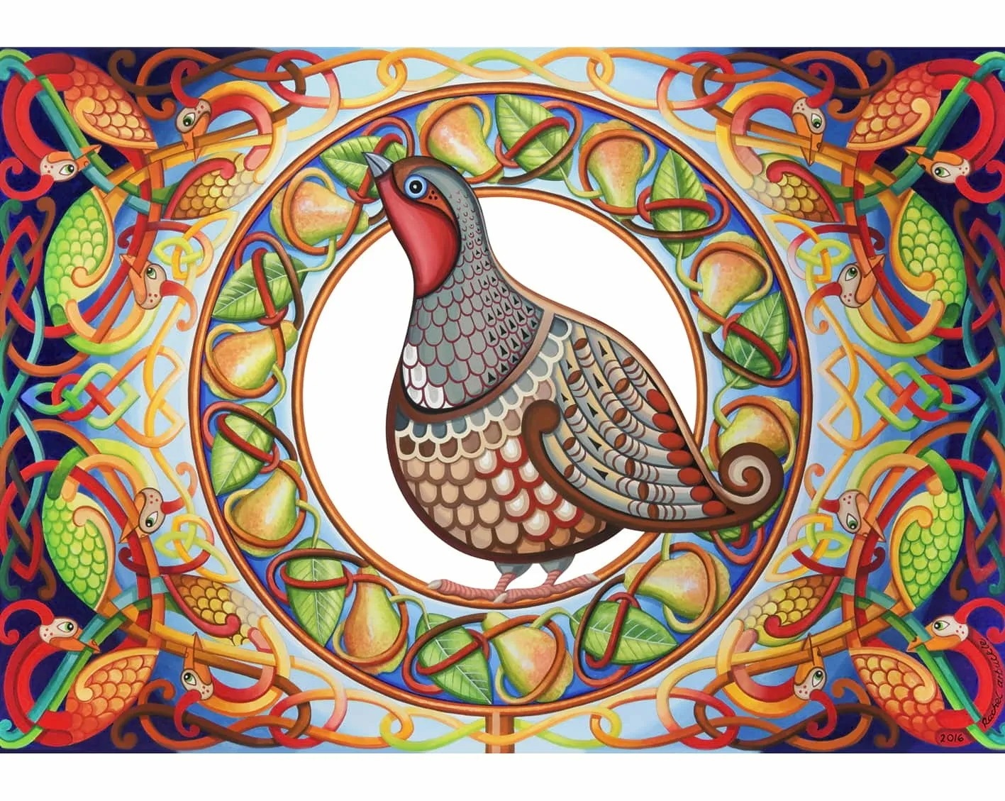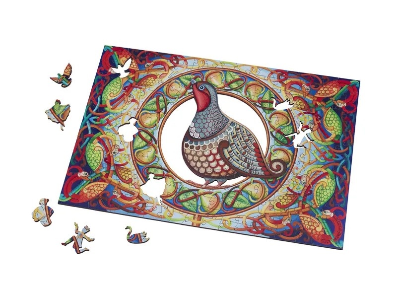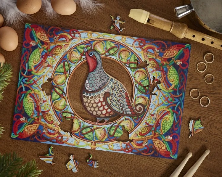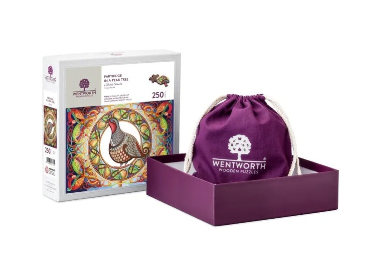 Partridge in a Pear Tree is part of Wentworth's exclusively commissioned 12 days of Christmas adult jigsaw puzzle range by artist Rachel Arbuckle. Rachel is a contemporary Irish artist whose work is inspired by Celtic knot-work treasures such as the Book of Kells and the Book of Durrow. Complete with specially designed whimsy pieces, this puzzle is sure to keep the whole family entertained this Christmas. Please note, the white cutout around the bird is empty and does not include any puzzle pieces.