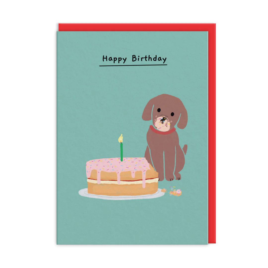 Switching gears with a dog cameo! Pat The Pooch devours birthday cake—Ken The Cat range style. Perfect for celebrating dog-lovers with sweet tooths. Card comes with a red envelope and is blank inside for a personal message.