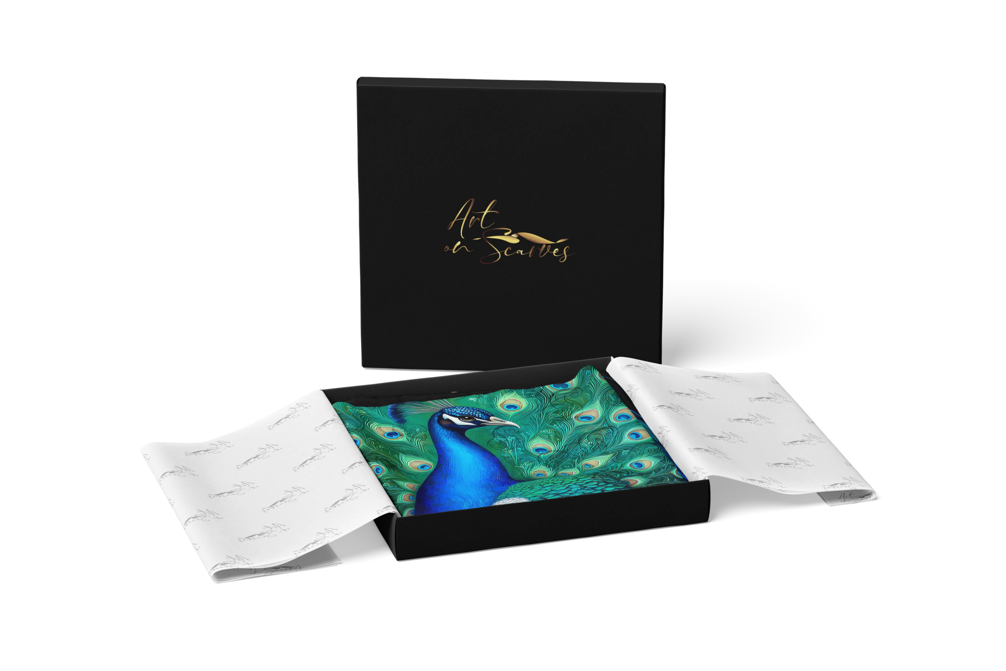 This luxury 100% silk twill peacock scarf from Art on Scarves has been designed, woven and printed in the UK, using traditional and modern techniques. The striking design is drawn from Britain's strong Celtic heritage and traditions, combined with the incredibly diverse wildlife found in Britain today.