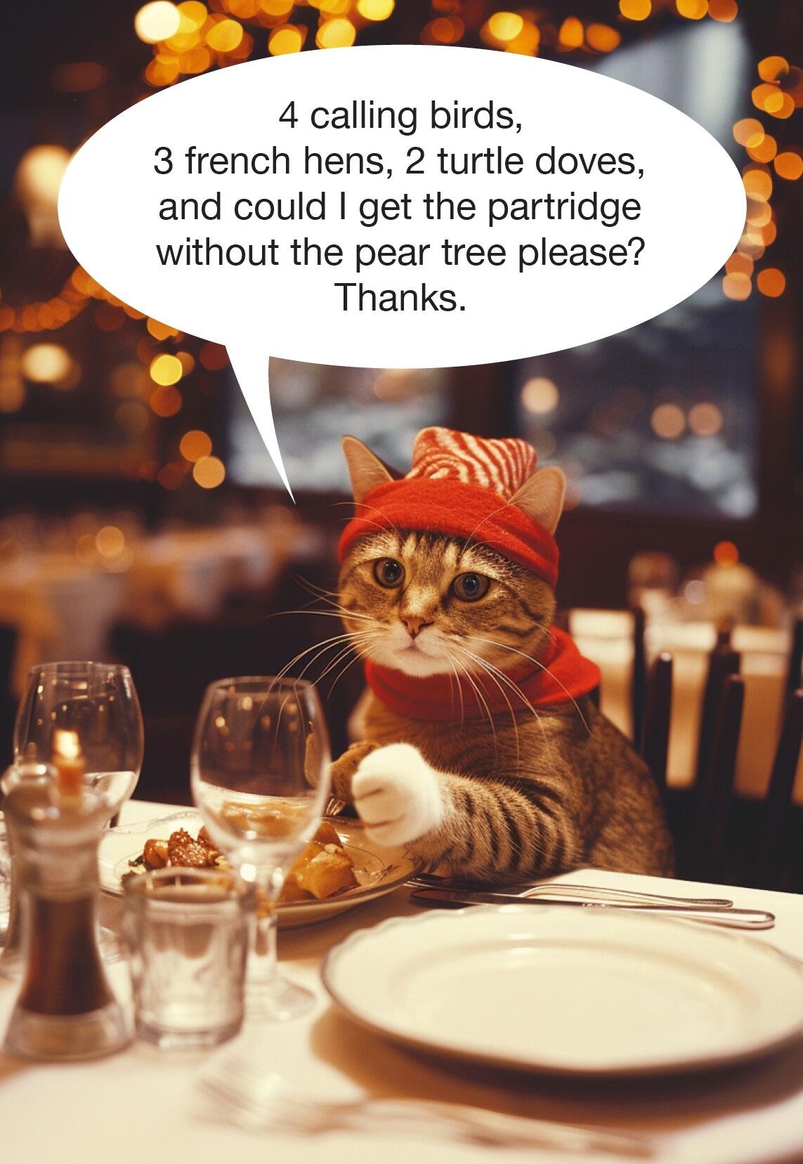 Front reads: 4 Calling birds, 3 French hens, 2 Turtle doves and could I get the partridge without the pear tree please?
