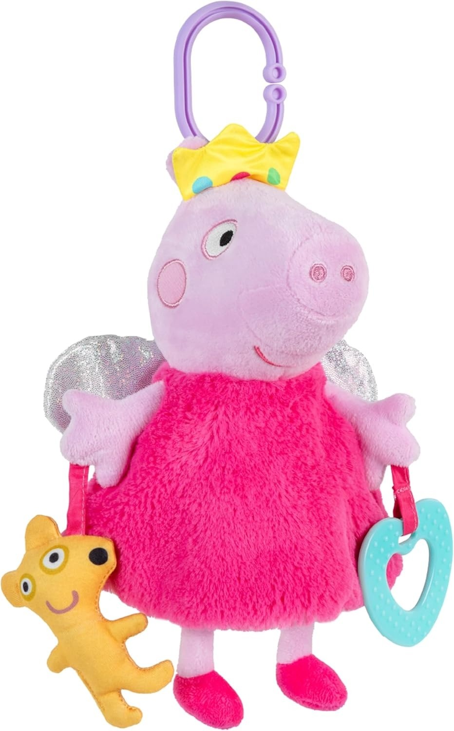 Inspired by the cheerful spirit of Peppa Pig, this Fairy-themed activity toy brings imaginative play to life with sparkle, sound, and soothing features. It has a heart-shaped teething ring, crinkle texture in the crown, and a rattle in the body. With a convenient on-the-go clip for attaching to strollers, car seats, or diaper bags, this Peppa Pig Fairy toy makes a charming baby shower gift, travel companion, or collectible piece for Peppa fans from birth and up. Surface wash.