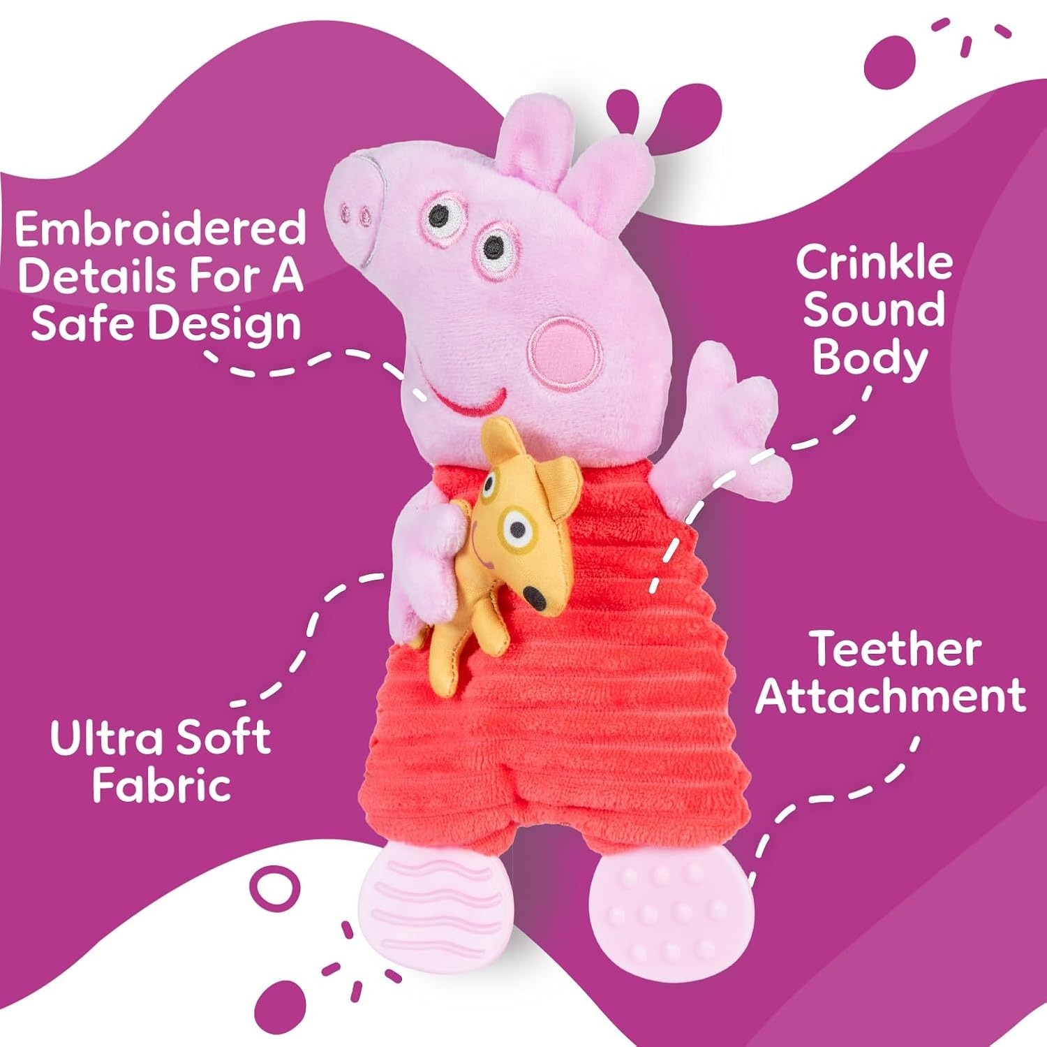 Crafted with soft, textured material and embroidered details, this baby blankie provides comfort and tactile stimulation. With Crinkle in her body, Peppa is designed to captivate, offering endless entertainment for infants. The two soft baby teethers in the form of Peppa's feet soothe gums, making them essential for teething relief. Surface wash.