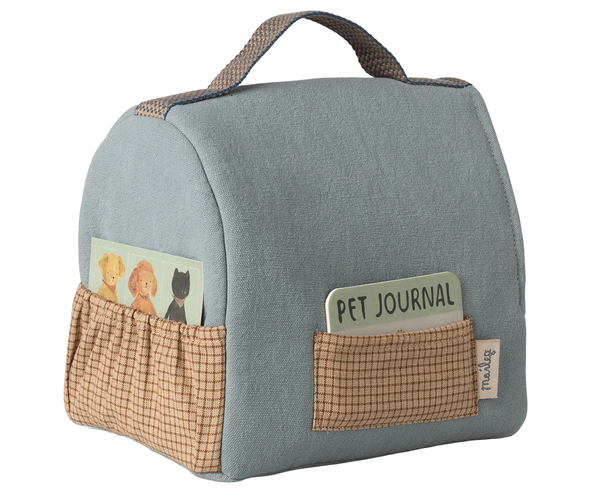 Extend the story and playscene for your stuffed animal with this beautiful accessory. This carrier is made to carry your friend all around very easily. It includes a pet ID so it is easy to see who the carrier belongs to.