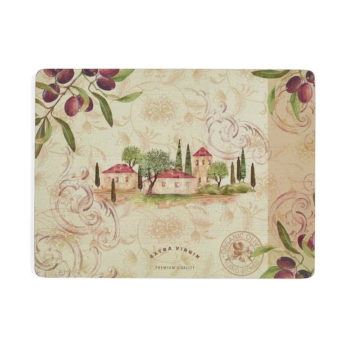 Sit back and savor the sweet taste of the Mediterranean with this set of four charming Olive Orchard placemats. Exquisitely decorated with ripe olive branches and an idyllic village scene, they’re ideal for any occasion, be it a simple family supper or a dinner party with friends. These quality placemats are a 5mm board with a unique and exclusive art print, sealed with a high-quality coating that is both stain and heat-resistant to 212°F and finished with a hard-wearing cork back to protect furniture. Clean with a damp sponge and dry with a soft cloth. Do not immerse in water.