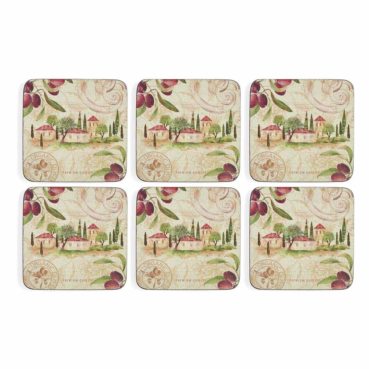 Drink in the unspoilt view of the rustic Mediterranean with these Olive Orchard coasters. Each piece in this charming set of six depicts a traditional village scene alongside vibrant purple and green olive branches and would look very much at home on your kitchen table. These quality coasters are a 5mm board with a unique and exclusive art print, sealed with a high-quality coating that is both stain and heat-resistant and finished with a hard-wearing cork back to protect furniture. Clean with a damp sponge and dry with a soft cloth. Do not immerse in water.