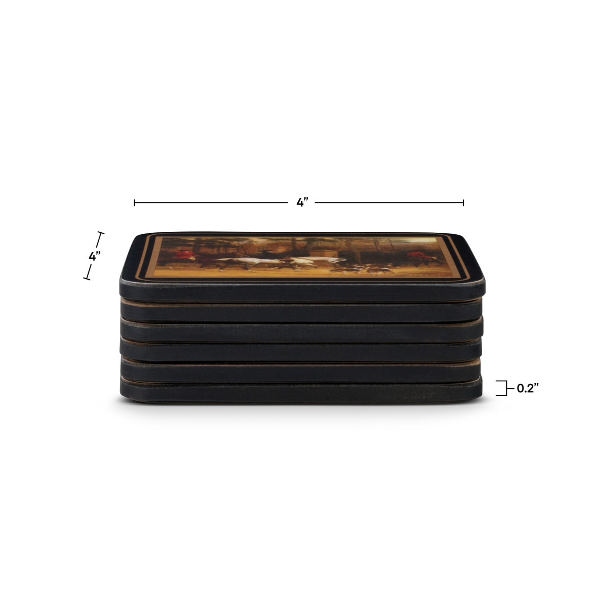 Depicting six different traditional hunting scenes, Tally Ho coasters are bordered in black with gold accents. These quality coasters are a 5mm board with a unique and exclusive art print, sealed with a high-quality coating that is both stain and heat-resistant to 212°F and finished with a hard-wearing cork back that protects precious furniture. Clean with a damp sponge and dry with a soft cloth. Do not immerse in water.