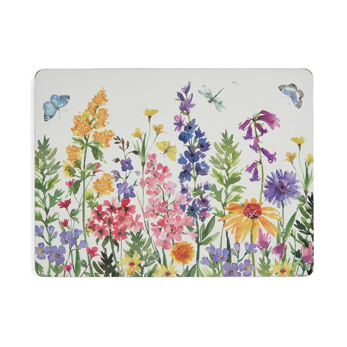 Brighten your dining space with a colourful meadow of wildflowers and fluttering butterflies. Each piece in this gorgeous set of four large Wildflowers placemats is a glorious floral tribute, featuring hot pink, bright yellow and vivid purple flowers. These quality placemats are a 5mm board with a unique and exclusive art print, sealed with a high-quality coating that is both stain and heat-resistant to 212°F and finished with a hard-wearing cork back to protect furniture. Clean with a damp sponge and dry with a soft cloth. Do not immerse in water.