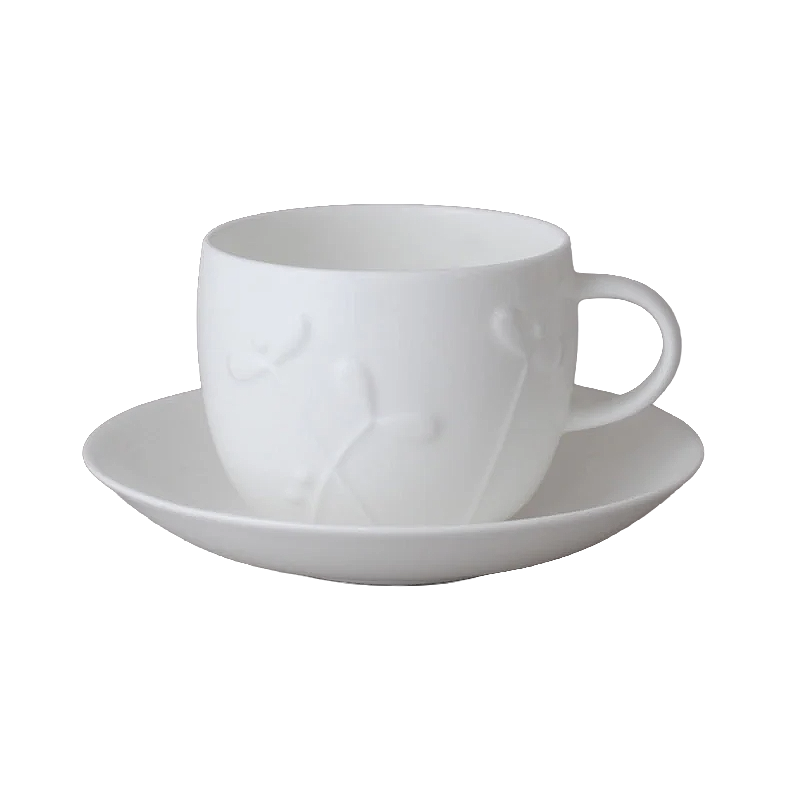 This Plum Flower teacup and saucer is part of Repeat Repeat's popular white bone china range with raised 3D patterns. It makes a simple cup of tea or coffee feel that little bit more special. This delicate bone china teacup features the popular Cress pattern and sits on a plain white saucer. Microwave and dishwasher safe, but hand washing is recommended. Made in Stoke-on-Trent, England.