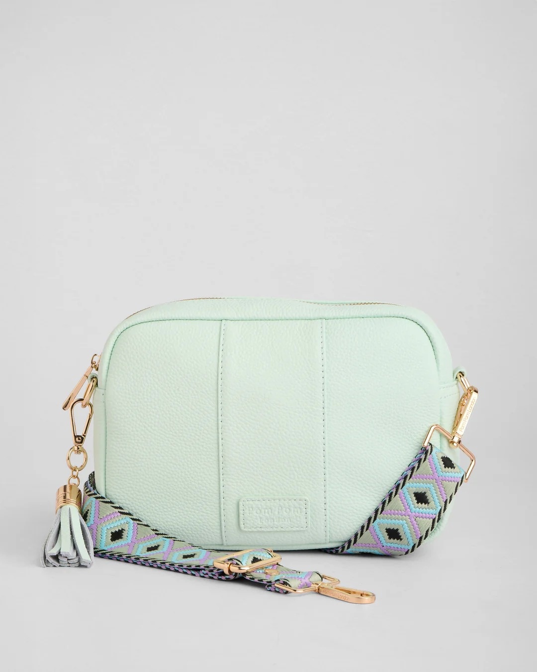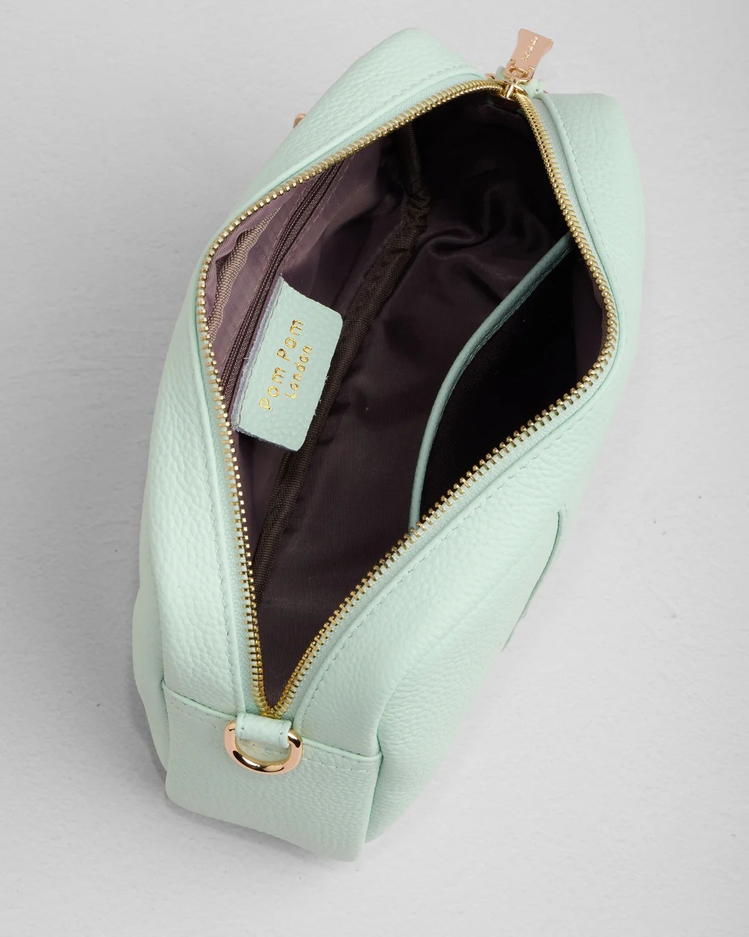 It features an internal zip side pocket, an open side pocket for easy organization, two external zip compartments for added convenience, fabric lining, and a double-reinforced leather base for added durability. It is accented with Pom Pom London’s iconic gold details. The matching, detachable leather strap extends up to 56".