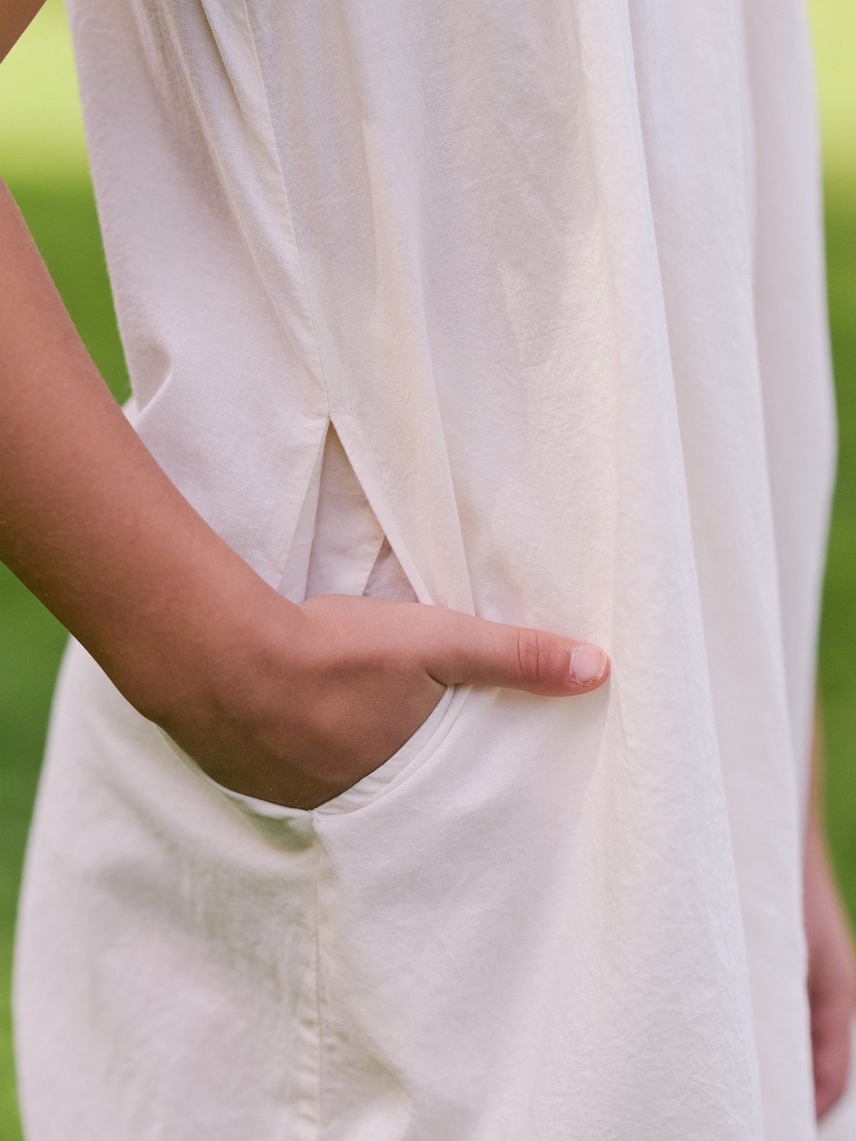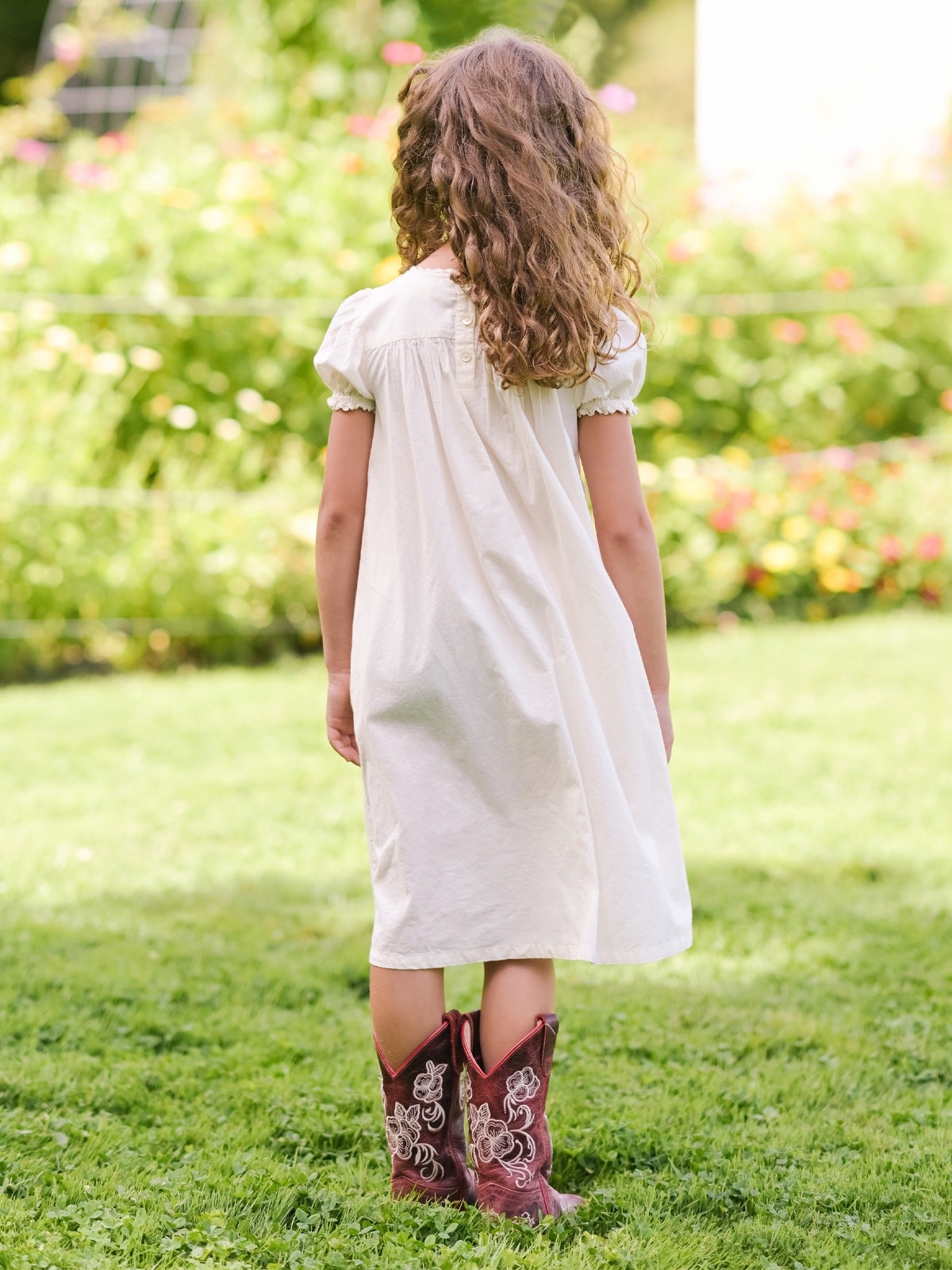 Sunlit prairies follow this ecru cotton dress, traced with glorious neckline embroidery, crochet trim, gentle gathers, and love in every stitch. Machine wash on gentle cycle, hang to dry.