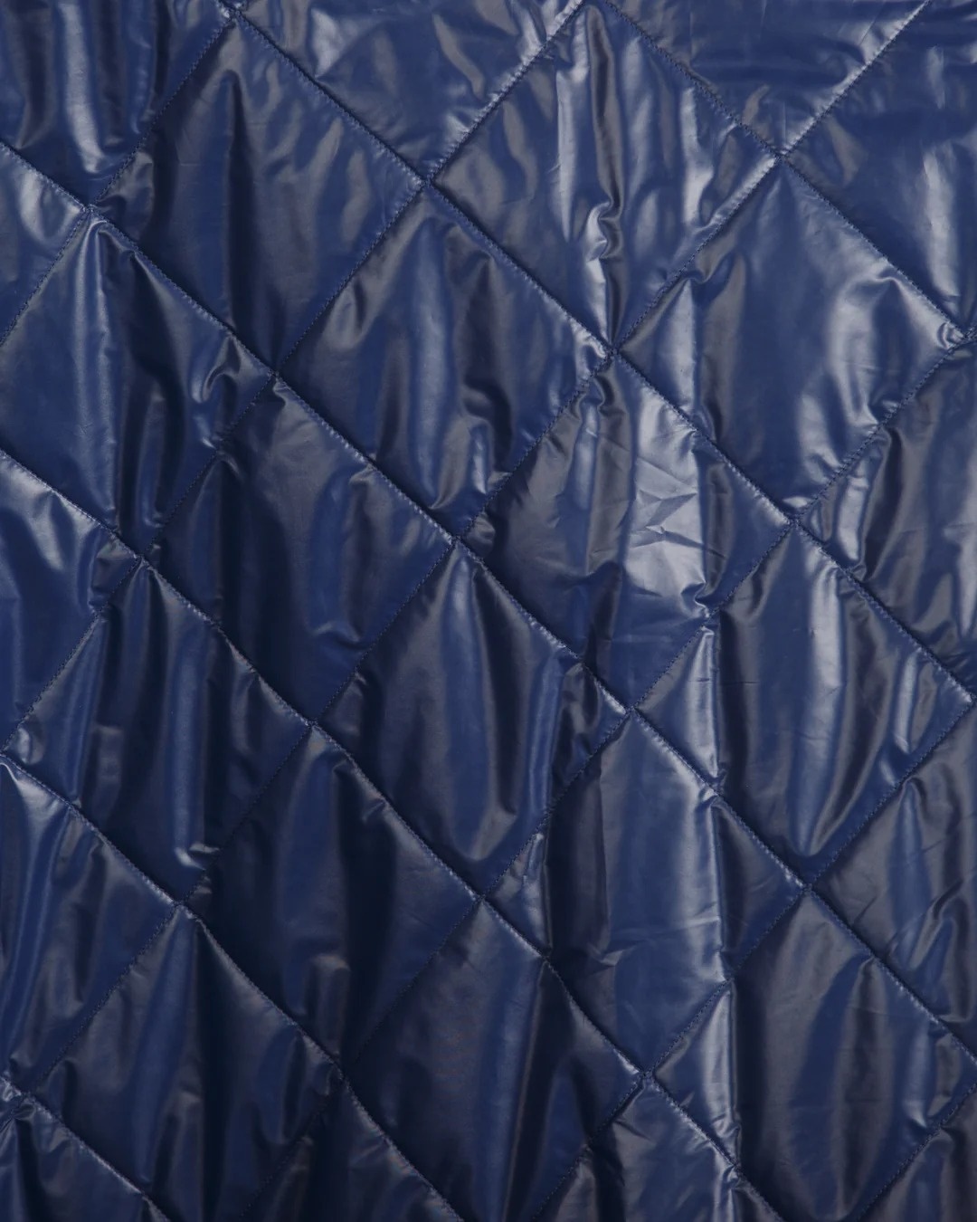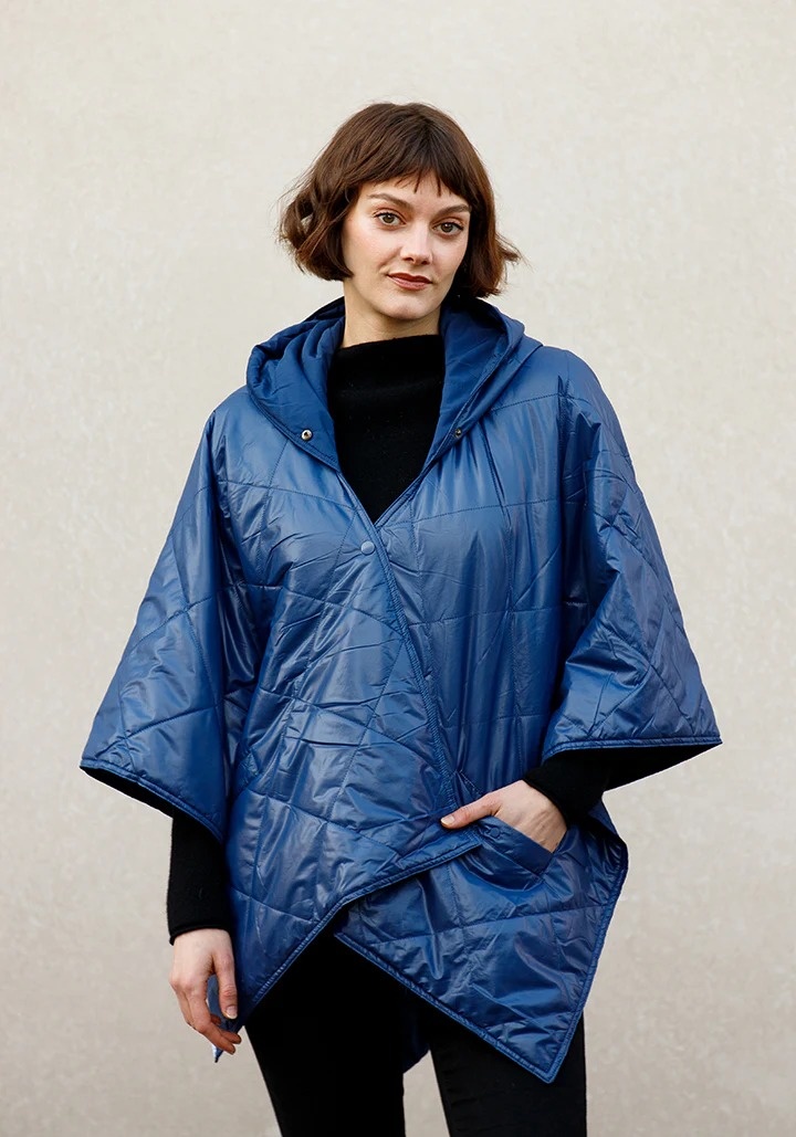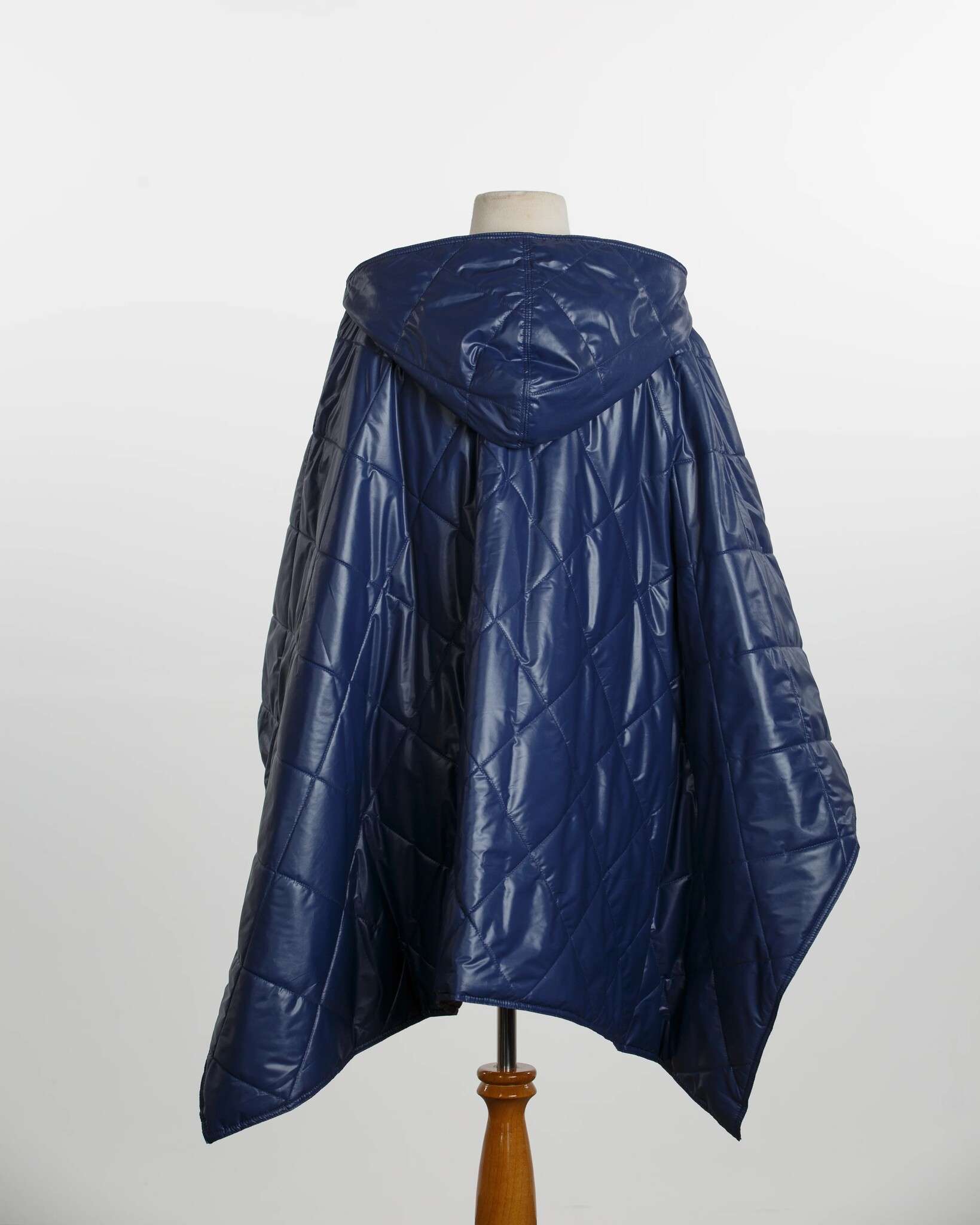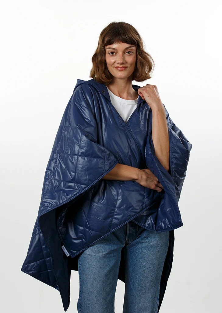 This navy blue puffer rain jacket is a fashionable and practical alternative to traditional rain gear. It is water-repellent, reversible, lightweight, fast-drying, has convenient snaps and two front pockets, and is easy to store in its matching travel pouch.