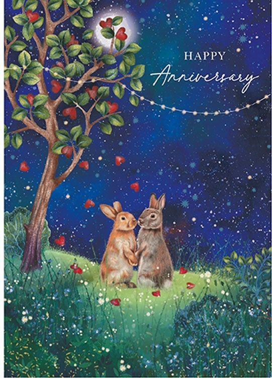 Wish someone a happy anniversary with this card, featuring a pair of rabbits in the moonlight and a tree with heart-shaped fruit. Inside it reads, "It doesn't matter where you go in life, it's who you have beside you that makes it worthwhile. I love you."
