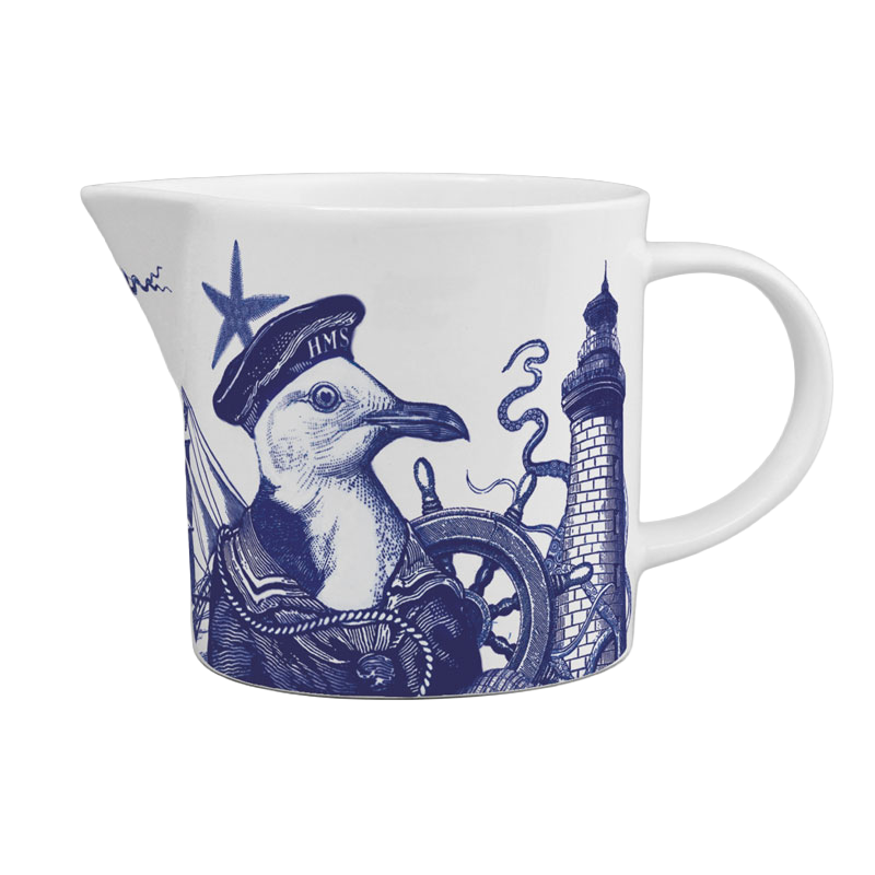 This Cobaltic Sea Jug adorned with a seagull holds around half a pint. This design was inspired by all things nautical featuring a seagull dressed as a sailor, a ships wheel, an anchor and lighthouse set in an eccentric maritime world. Printed in classic cobalt blue perfect for coastal themed interiors. Fine bone china. Made in Stoke-on-Trent, England. Hand wash recommended.
